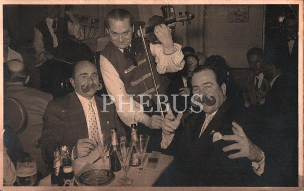İçki masasında takma bıyıkları ve hınzır bakışlı kemancıyla kameraya poz veren yabancı beyefendiler, 14x9 cm