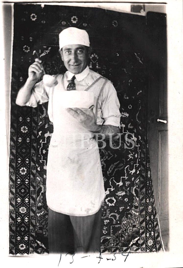 Aşçı giysileri içinde, elinde çorba kâsesiyle poz veren beyefendi, 13 Temmuz 1934, 7x10 cm