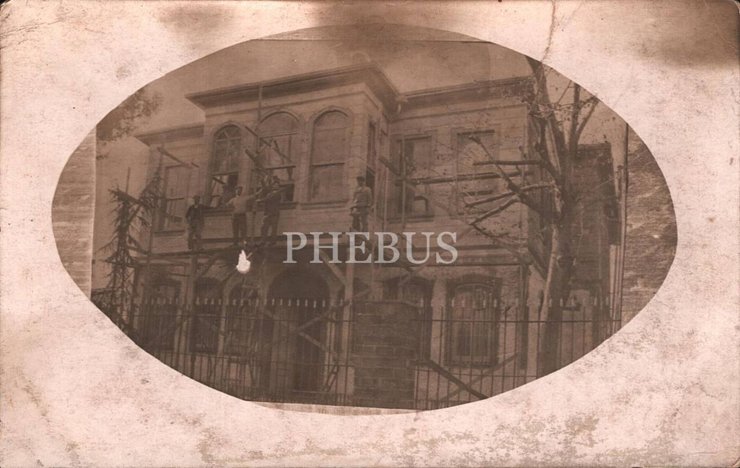 Gebze Hükümet Konağı´nın onarımı esnasında inşaat iskelesi üzerinde poz veren işçiler, 14x9 cm