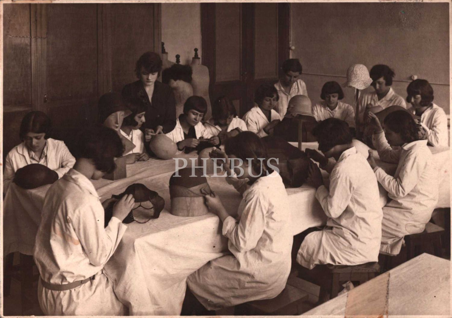 Şapka atölyesinde çalışan genç kızlar, 17x12 cm, iki köşesi bantlanmış haliyle