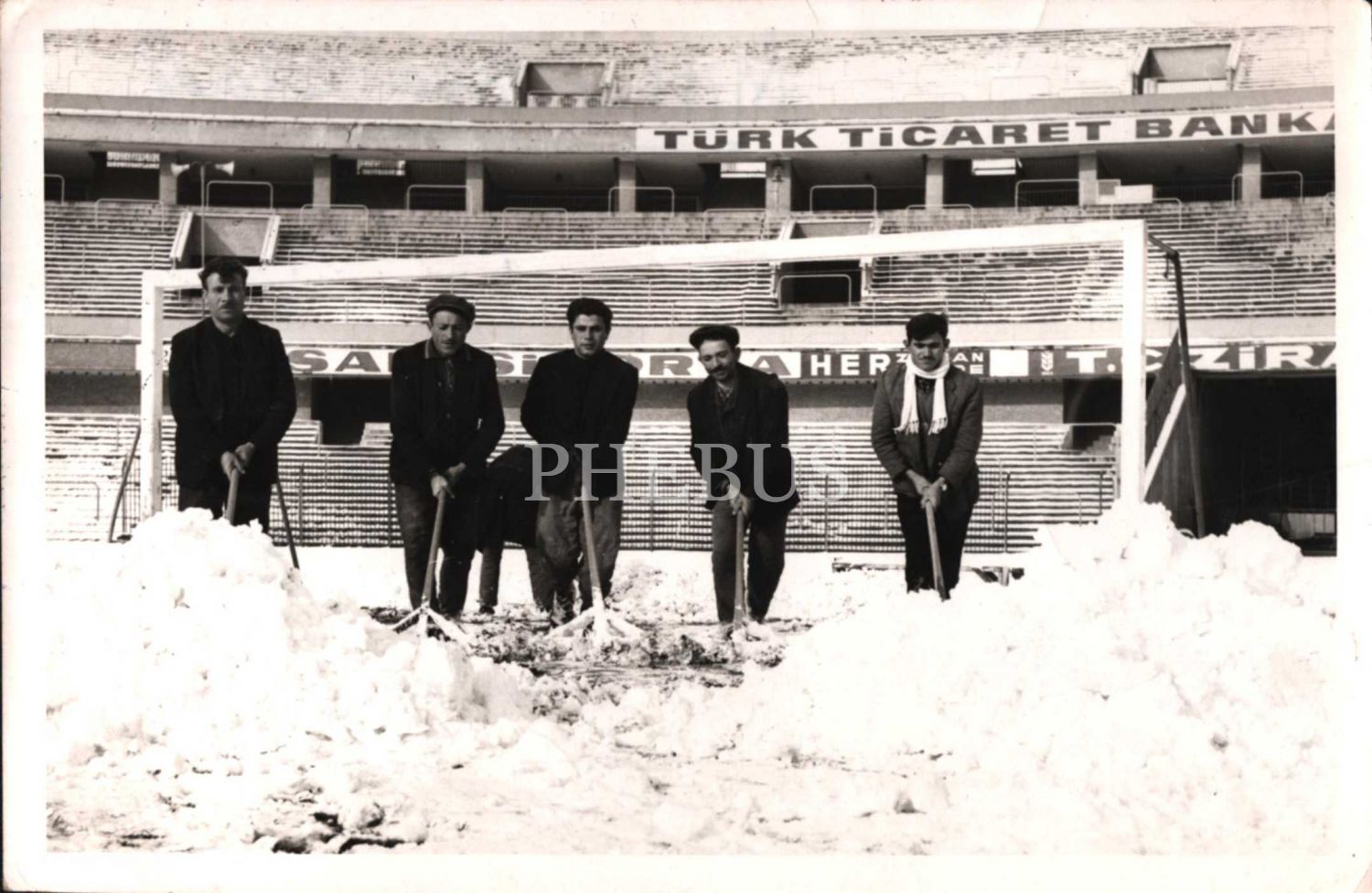 "Karla kaplı olan Dolmabahçe Stadı maçlara hazırlanmak için temizlenirken", arka yüzü "Tercüman Arşivi" damgalı, 18x12 cm