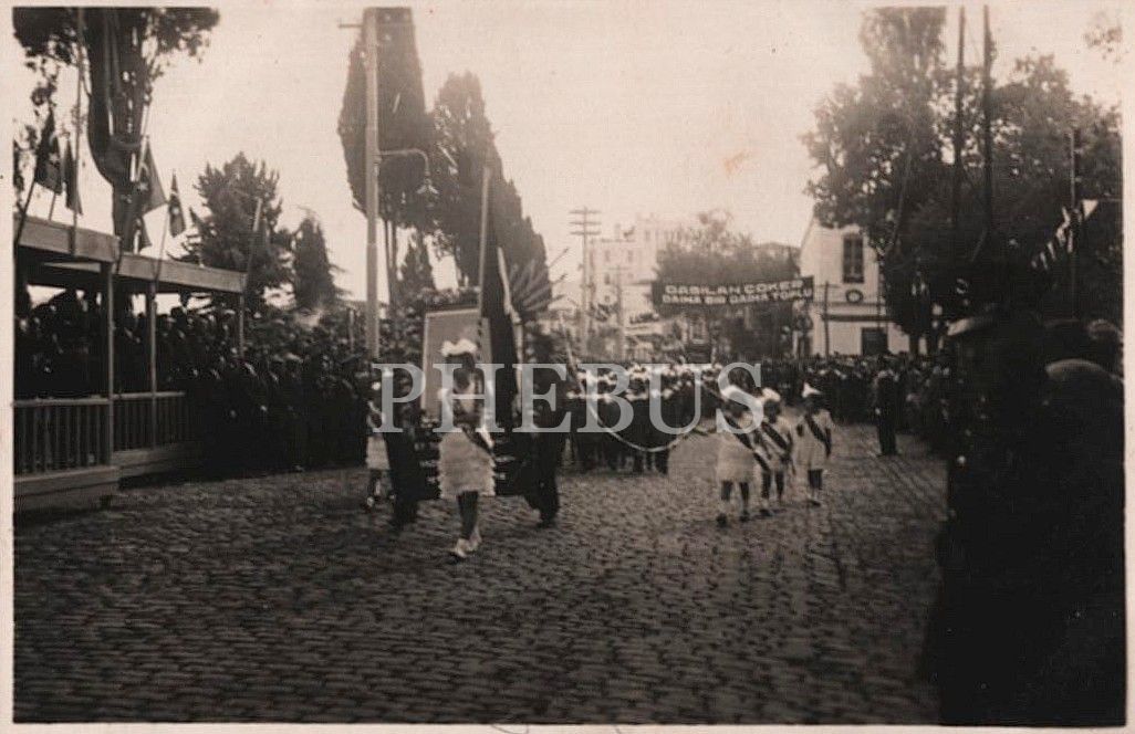 "Dağılan Çöker / Daima Bir Daima Toplu" afişinin görüldüğü bir bayram kutlaması, 9x6 cm