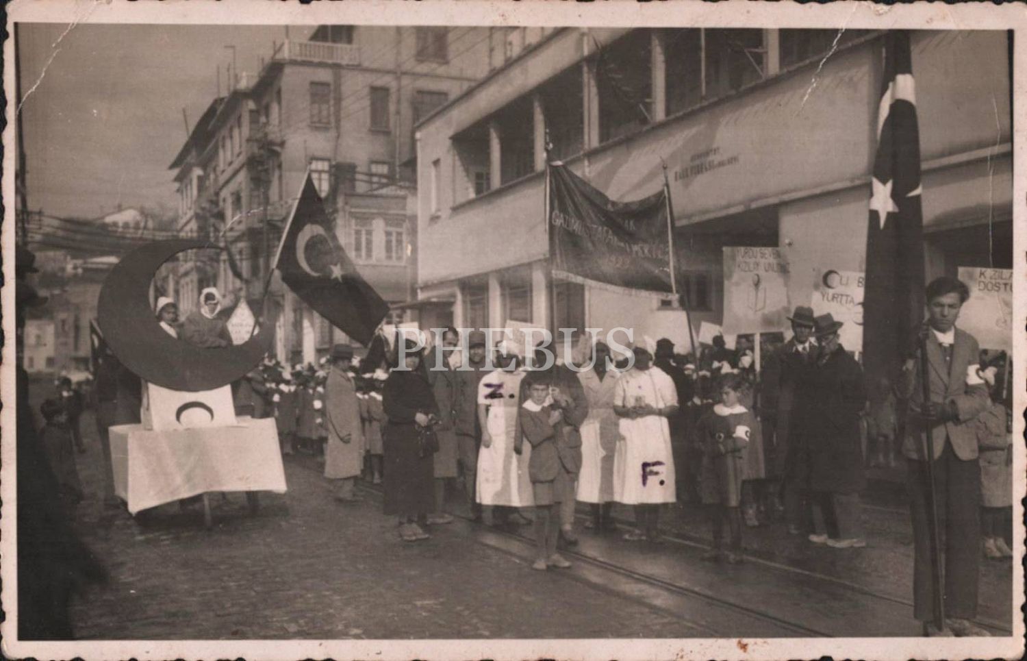 "Gazi Mustafa... Mektebi - 1929", "Yurdu Seven Kızılayı Unutmaz" afiş ve pankartlarıyla yürüyüş yapan mektep talebeleri, 14x9 cm