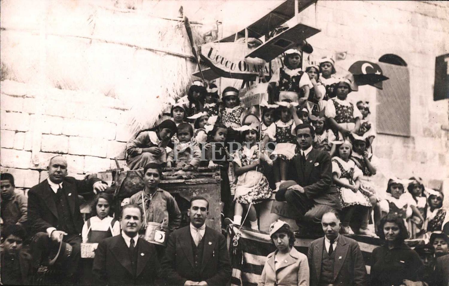 Üzerinde "Uçucu Olarak" yazısının seçildiği Türk bayraklı maket uçağın çevresinde bayram kıyafetleri ile poz vermiş mektep talebeleri ile öğretmenleri, 14x9 cm