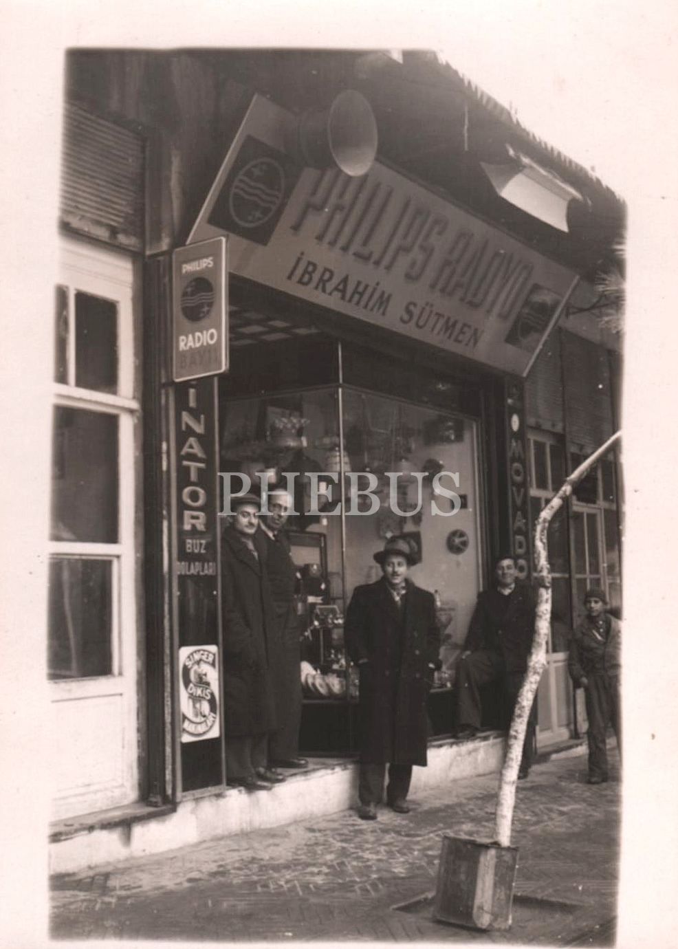 "Philips Radyo - İbrahim Sütmen" tabelalı dükkân önünde hatıra fotoğrafı, 7x9 cm