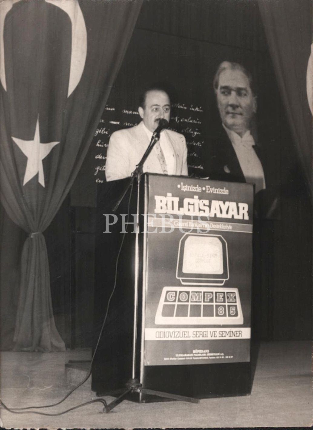 İstihdam, Bilim ve Teknolojiden sorumlu Devlet Bakanı Tınaz Titiz, "İşinizde-Evinizde Bilgisayar / Garanti Bankası´nın Destekleriyle..." afişli kürsüde konuşma yaparken, arka yüzü "Tercüman Arşivi" damgalı, 9x12 cm