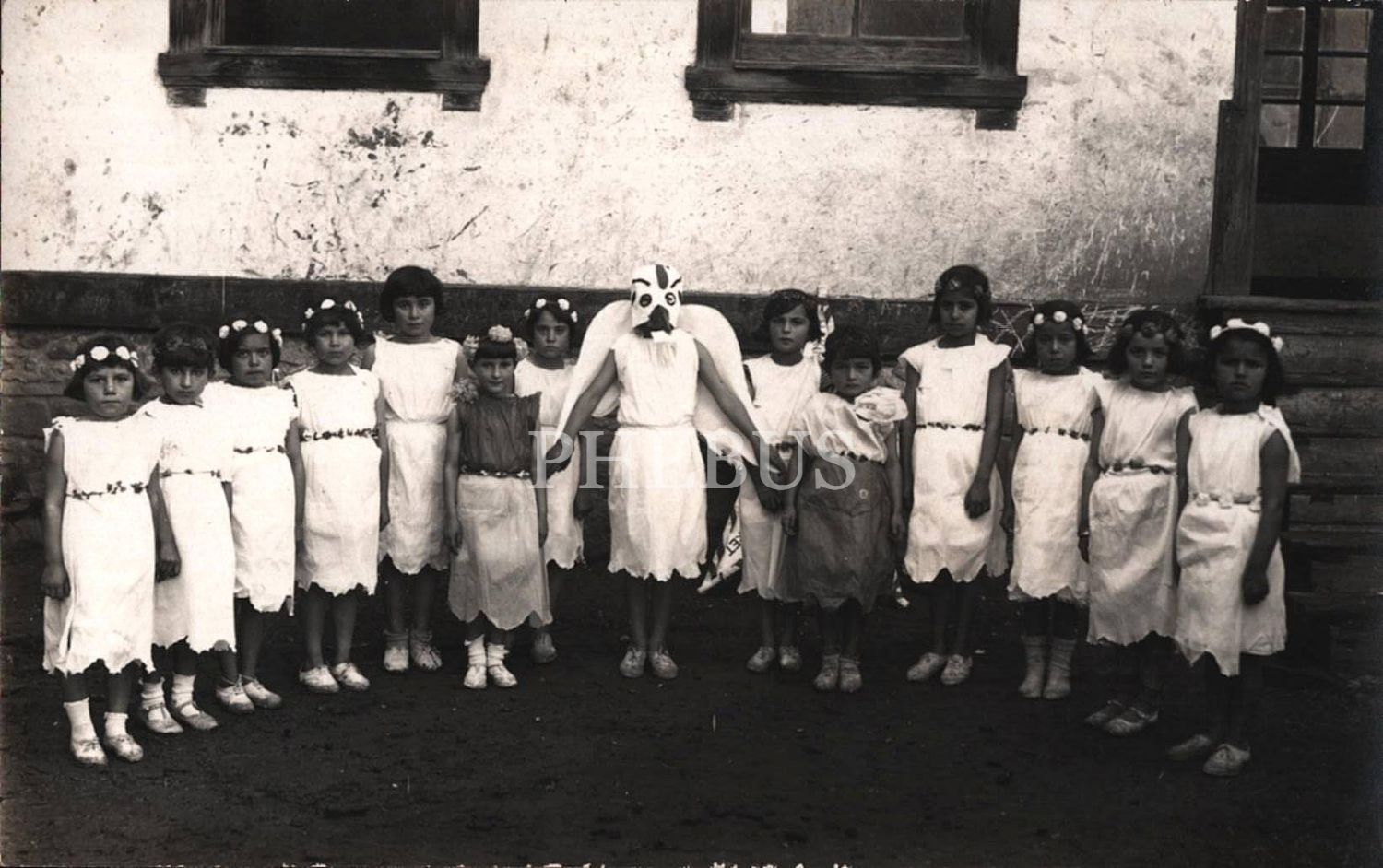 Cumhuriyetin 10. yıl dönümünde güvercin kostümlü ve çiçek taçlı İsmet Paşa ilk mektebi öğrencileri, 9x14 cm