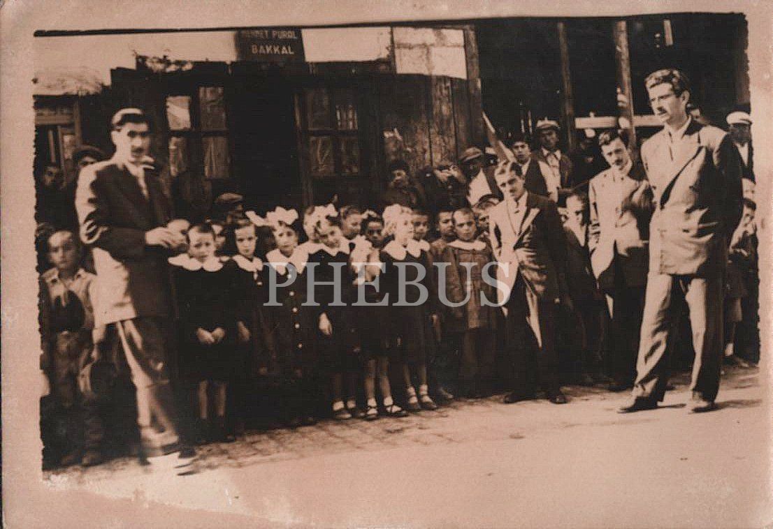 Bir tören için "Mehmet Pural Bakkal" tabelalı dükkânın önünde bekleyen ilkokul öğrencileri ile öğretmenleri, 10x7 cm