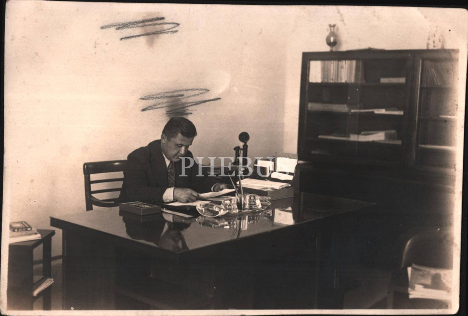 Masası başında işine odaklanmış bir beyefendi, 17x12 cm