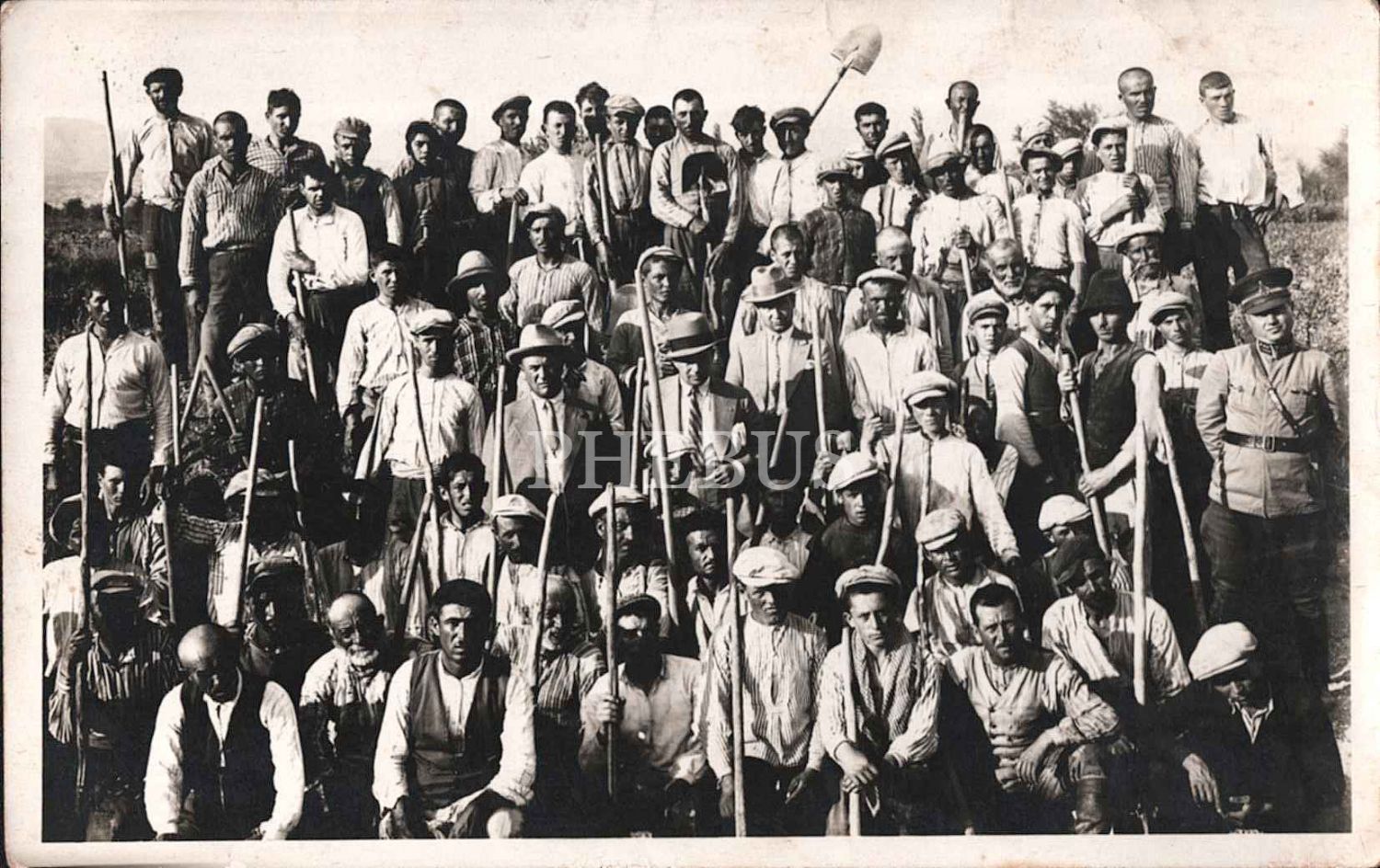 Ellerinde kürekleriyle çiftçiler ile fötr şapkalı memurlar, 14x9 cm