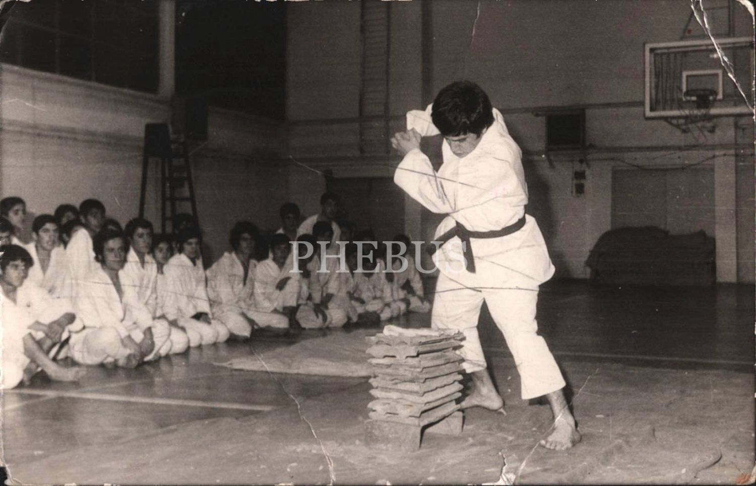 Tuğlaları kırmaya hazırlanan genç bir karateci, arka yüzü "Foto Kırcan" damgalı, 14x9 cm