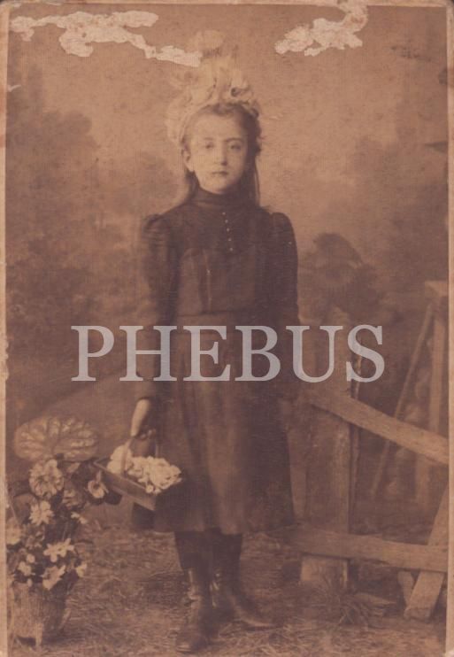Elinde çiçeği ile poz vermiş küçük hanımefendinin kabin fotoğrafı, N. Andriomenos Fotoğrafhanesi- Constantinople, 7x10 cm