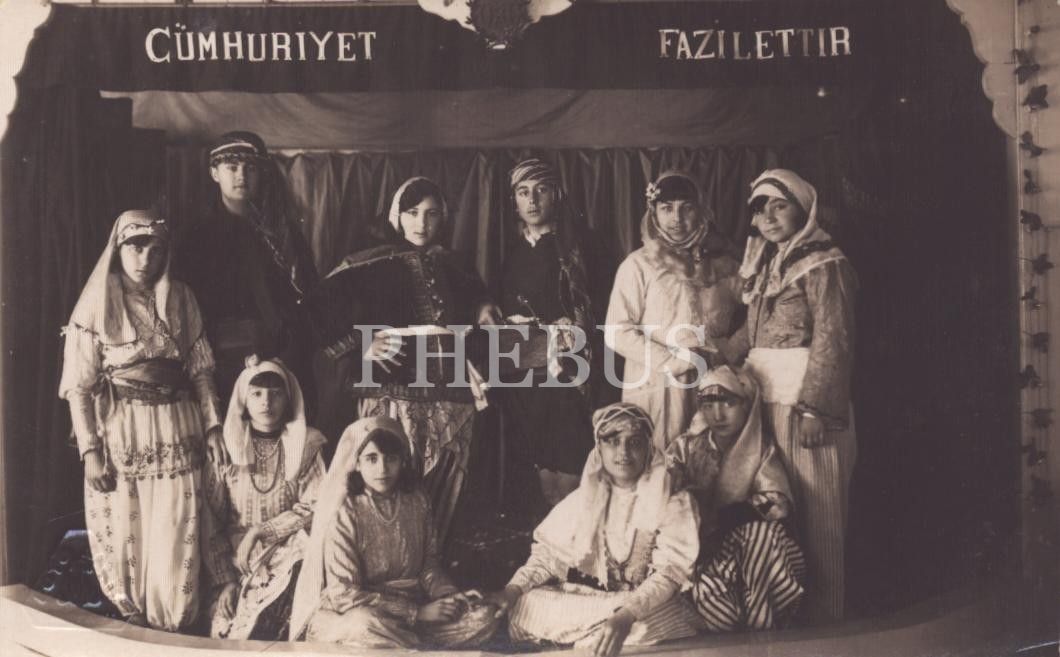 "Cumhuriyet Fazilettir" yazılı dekor sahnede yöresel kıyafetli öğrencilerin hatıra fotoğrafı, 8x14 cm