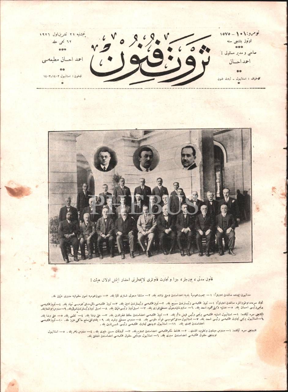 SERVET-İ FÜNUN dergisinin, Borçlar, Ceza ve Ticaret Kanunlarını hazırlayan heyete ait kapak görselli 101. sayısı, 21 Teşrin-i Evvel 1926, 24x32 cm