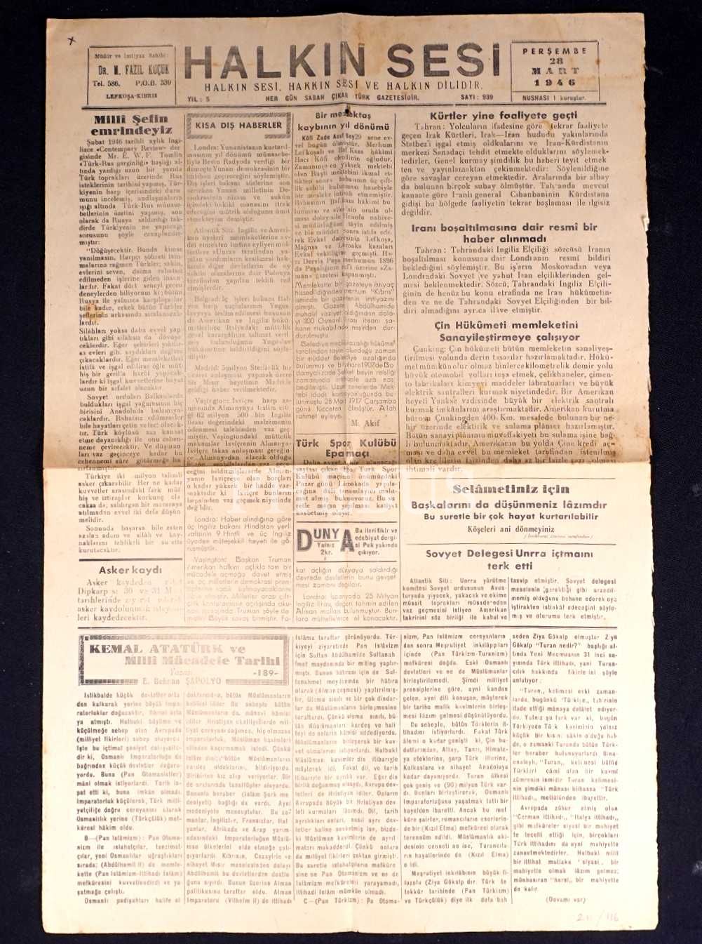 HALKIN SESİ gazetesinin Mart 1946 tarihli 939. sayısı, 31x48 cm