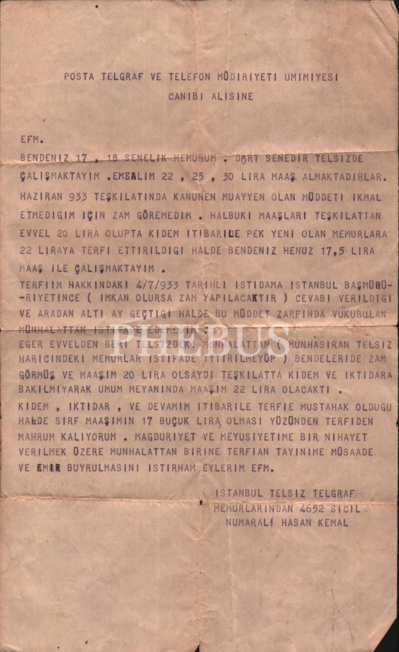 Posta Telgraf ve Telefon Müdiriyeti Umumiyesi´ne gönderilen zam ve terfi konulu resmî evrak, 20x33 cm