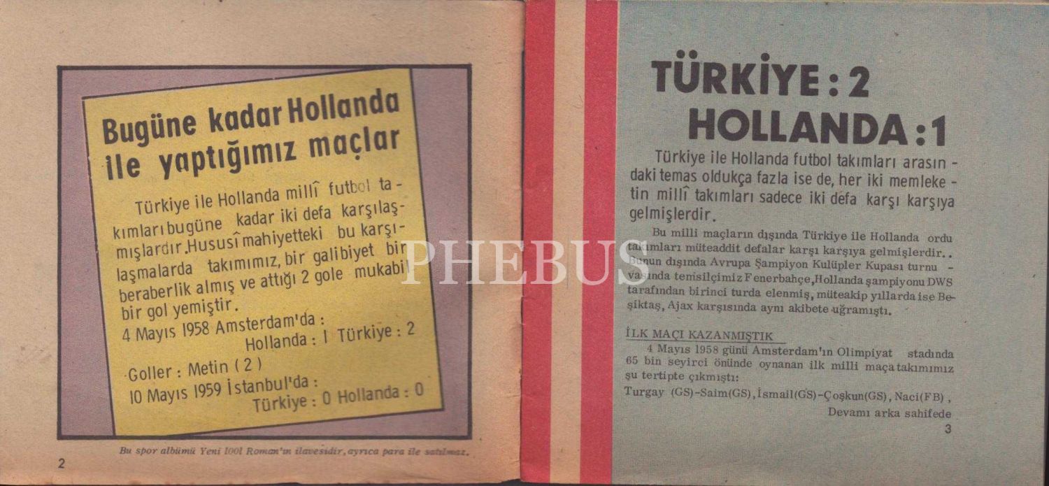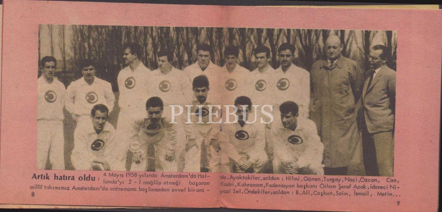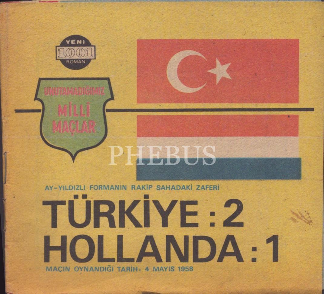 4 Mayıs 1958 tarihli Türkiye-Hollanda maçına dair bilgiler içeren UNUTAMADIĞIMIZ MİLLİ MAÇLAR kitapçığı, 15 s., 12x13 cm