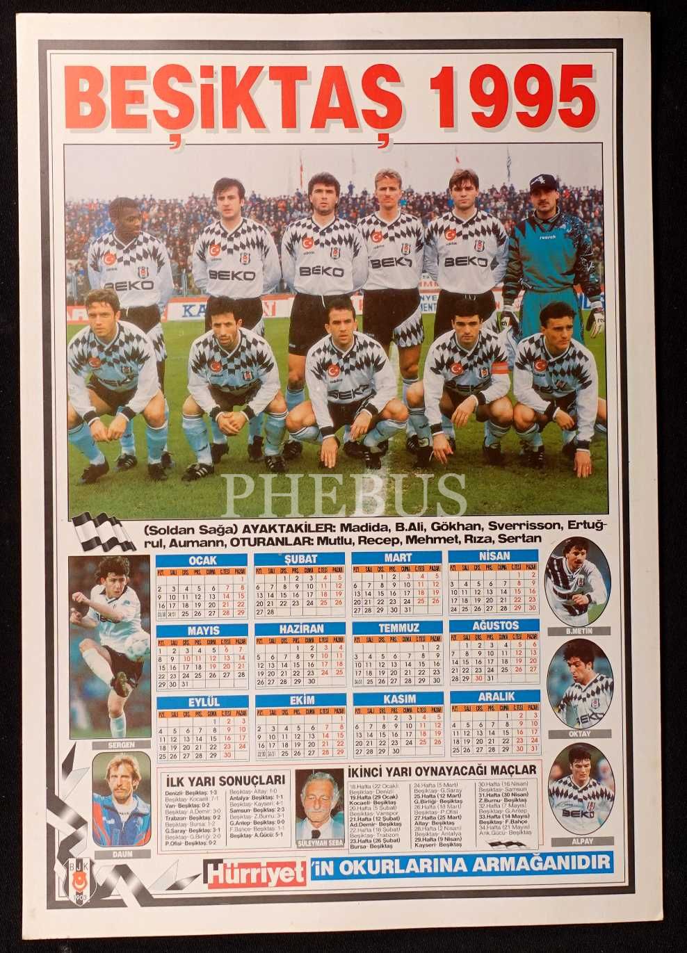 Hürriyet´in armağanı olarak Beşiktaş SK oyuncuları görseliyle 1995 yılı takvimi, 35x50 cm