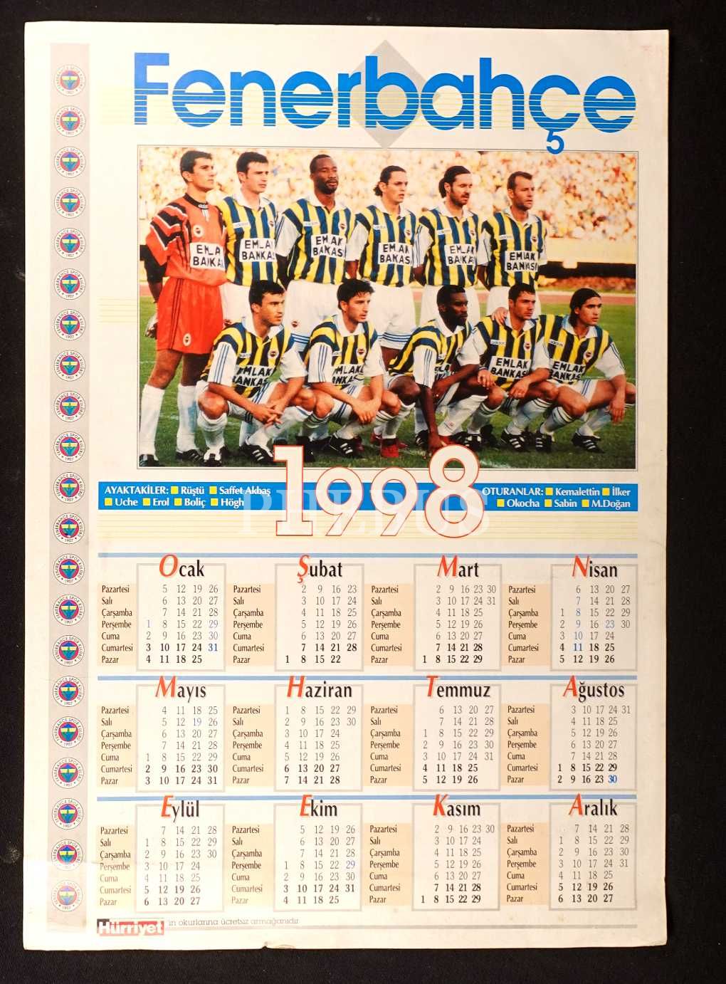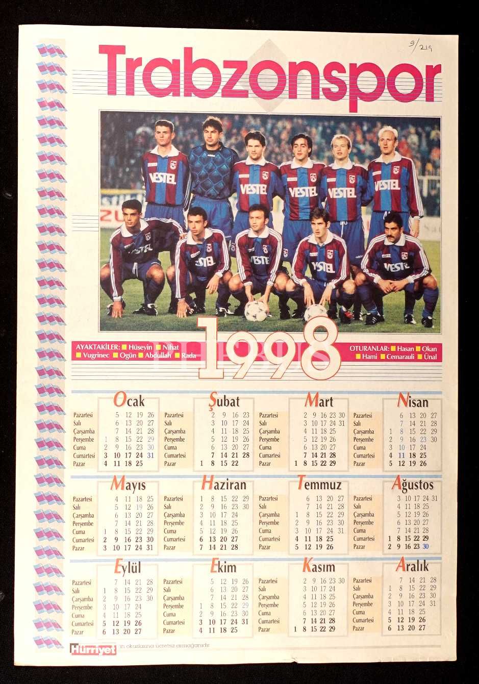 Hürriyet´in armağanı olarak Fenerbahçe ve Trabzonspor oyuncuları görseliyle 1998 yılı çift taraflı takvim, 35x50 cm