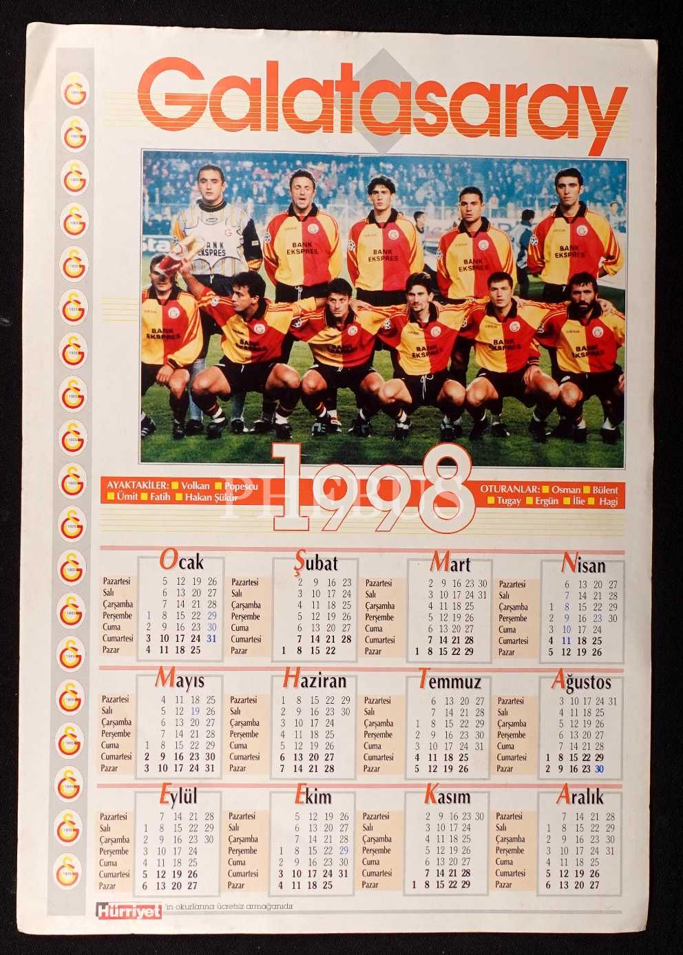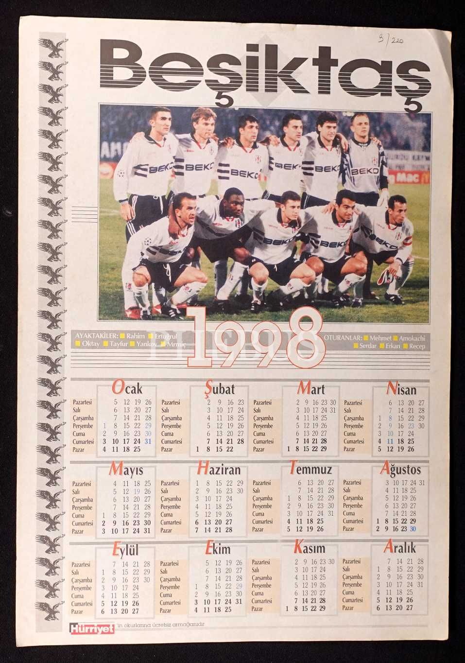 Hürriyet´in armağanı olarak Beşiktaş ve Galatasaray oyuncuları görseliyle 1998 yılı çift taraflı takvim, 35x50 cm