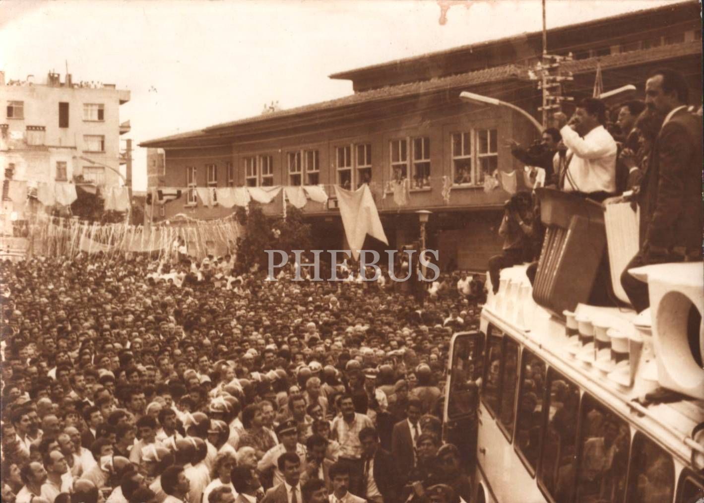 Türkiye Cumhuriyeti´nin 8. Cumhurbaşkanı Turgut Özal minibüs üzerinden halka seslenirken, 13x18 cm