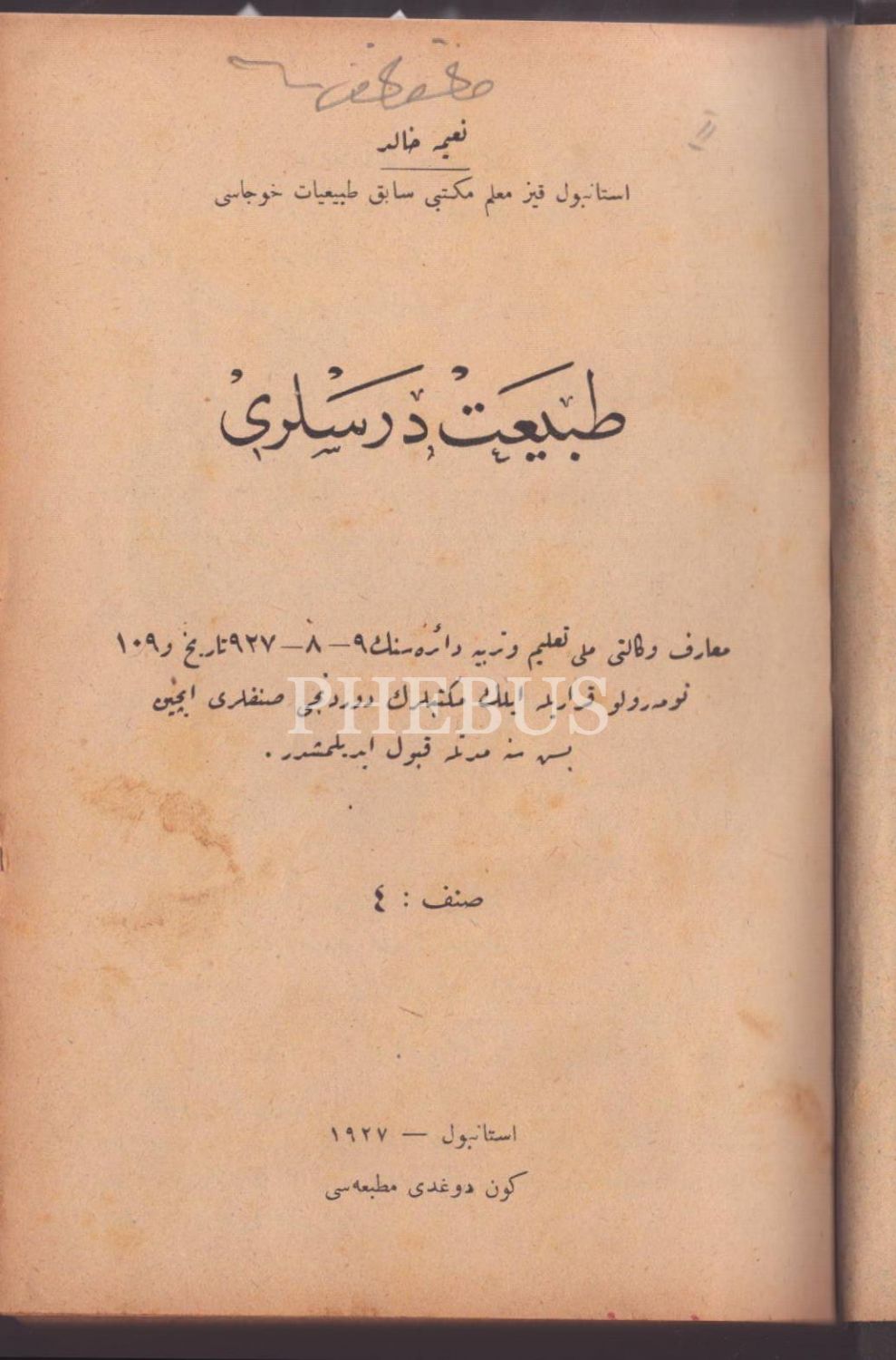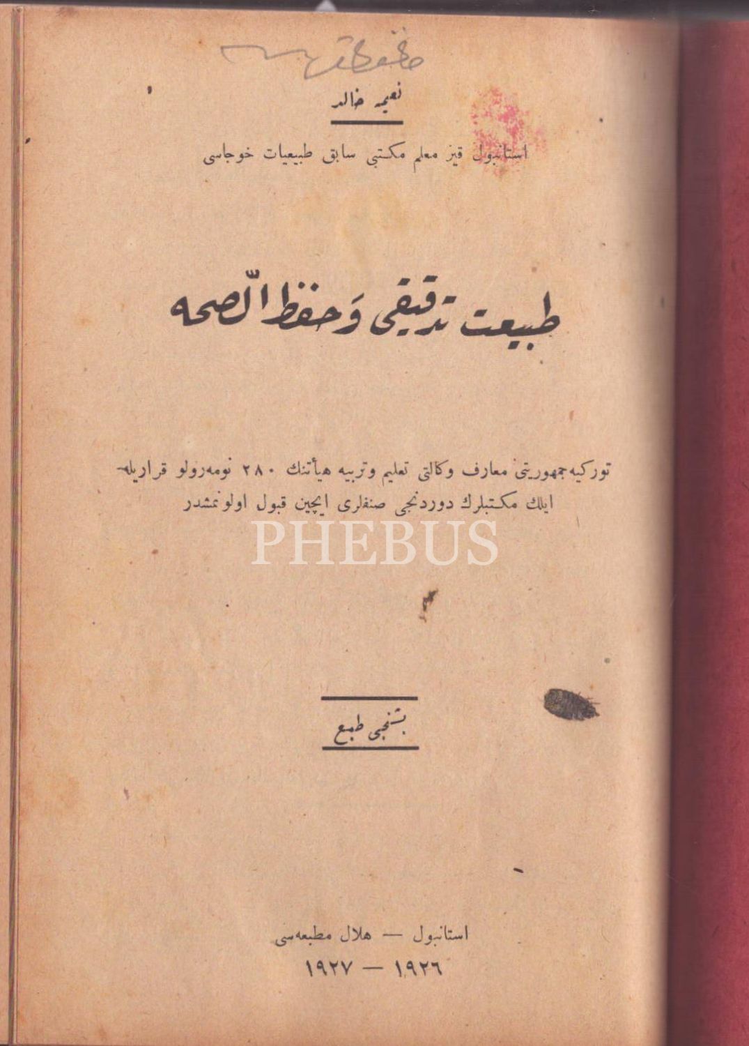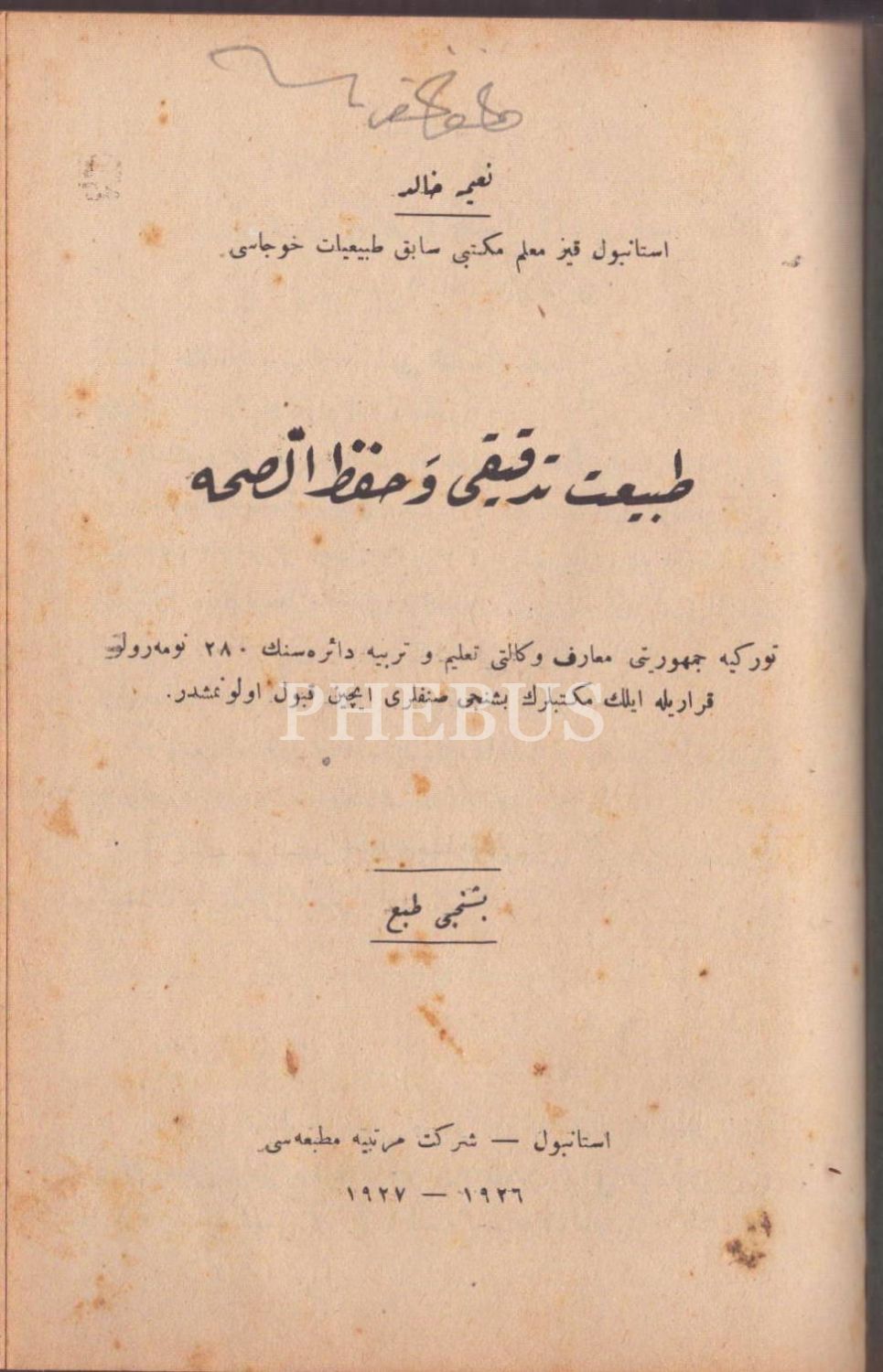 Kız Muallim Mektebi Tabiiyyat Hocası Naîme Hâlid´e ait 3 eser tek ciltte: TABÎAT DERSLERİ, Gündoğdu Matbaası, İstanbul 1927, 272 s.; TABÎAT TEDKÎKİ VE HIFZUSSIHHA, Hilal Matbaası, İstanbul 1927, 80 s.;