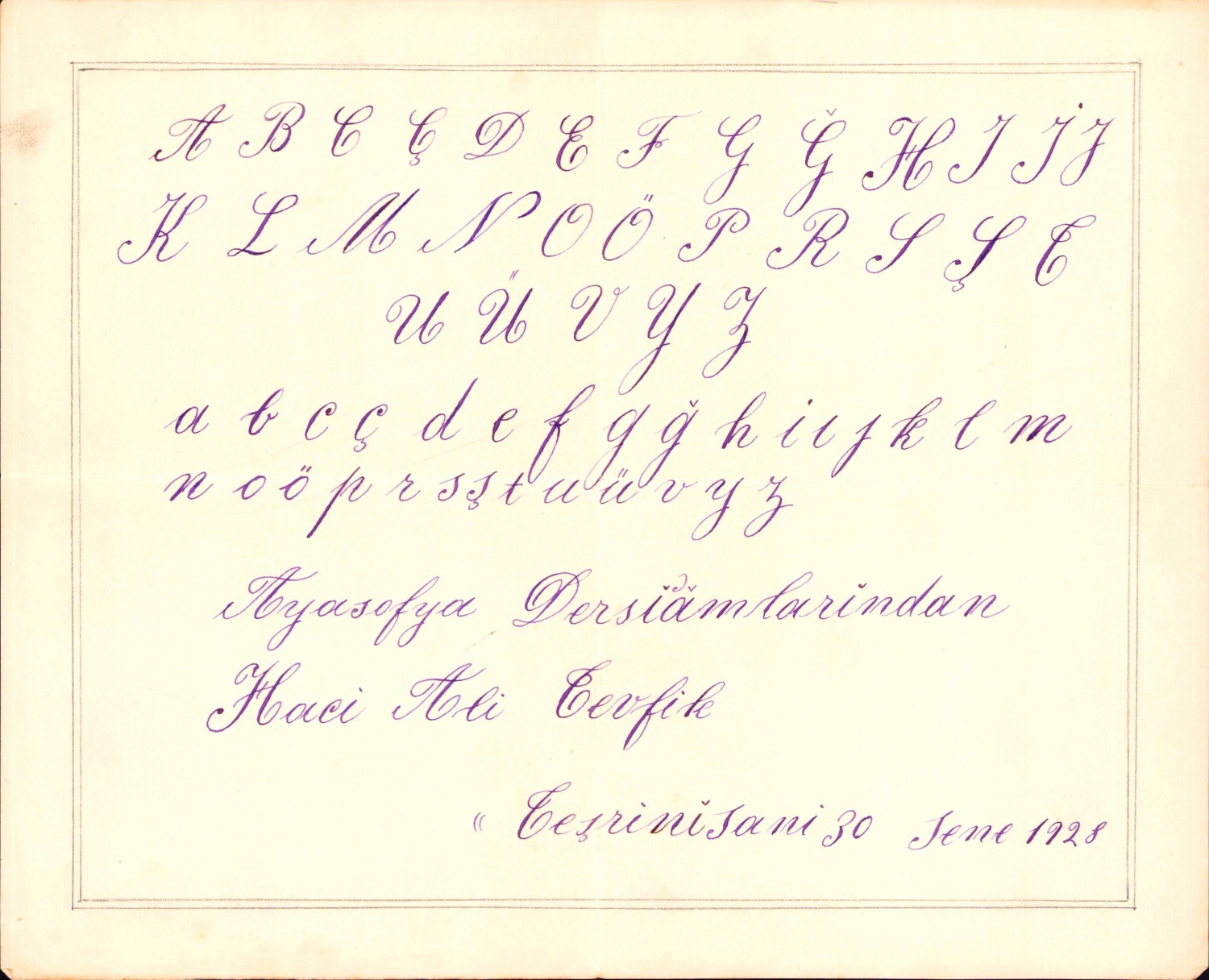 1928 tarihli Türkçe alfabe, Ayasofya Camii dersiamlarından Hacı Ali Tevfik, 20x26 cm