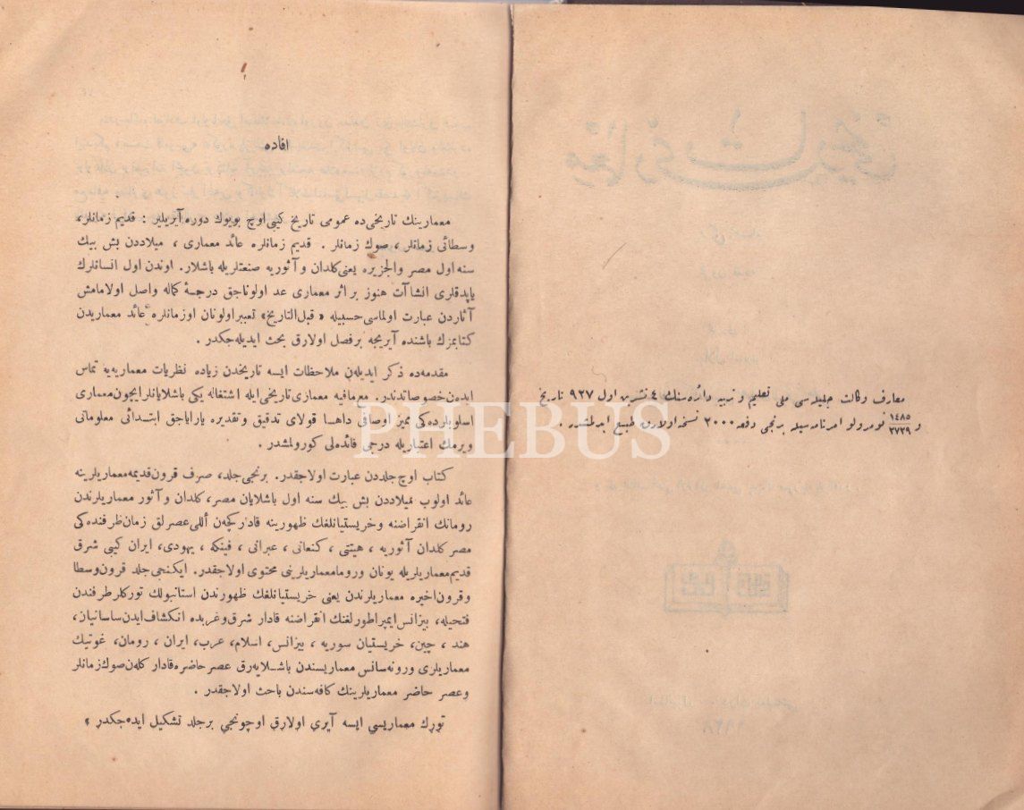 2 eser tek ciltte: MİMÂRÎ TÂRÎHİ (1. Cilt: Kurûn-ı Kadîme), Celal Esad, Devlet Matbaası, İstanbul 1928, 211 s. (176 ve 193. sayfalar arası eksik); MUHTASAR SANÂAT TÂRÎHİ, Baye, çev. Vahîd, Devlet Matbaası, İstanbul 1928, 184 s., 17x24 cm