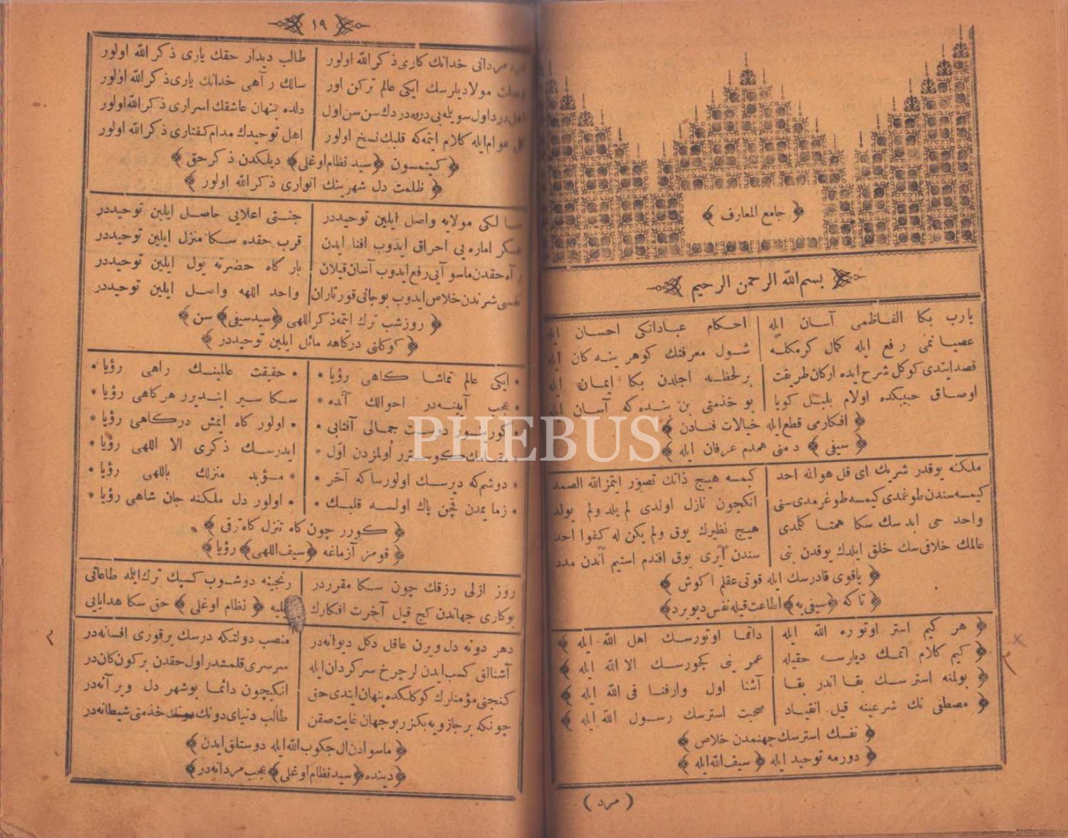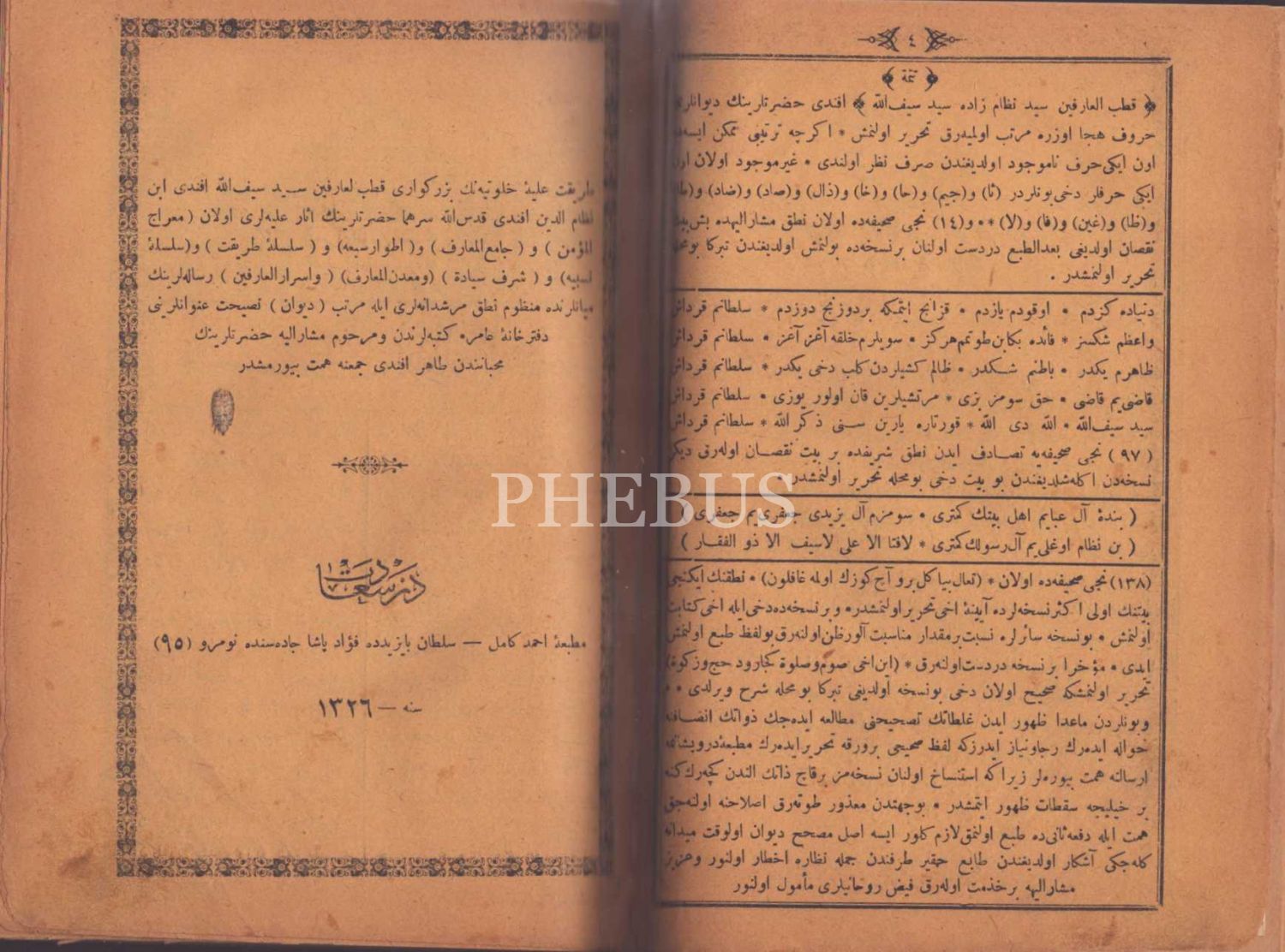 2 divan tek ciltte: DÎVÂN-I ÂŞIK YÛNUS EMRE, 1327, 188 s.; KUTBÜ´L-ÂRİFÎN SEYYİD SEYFULLAH EFENDİ DİVANI, Ahmed Kâmil Matbaası, İstanbul 1329, 190 s., 17x24 cm