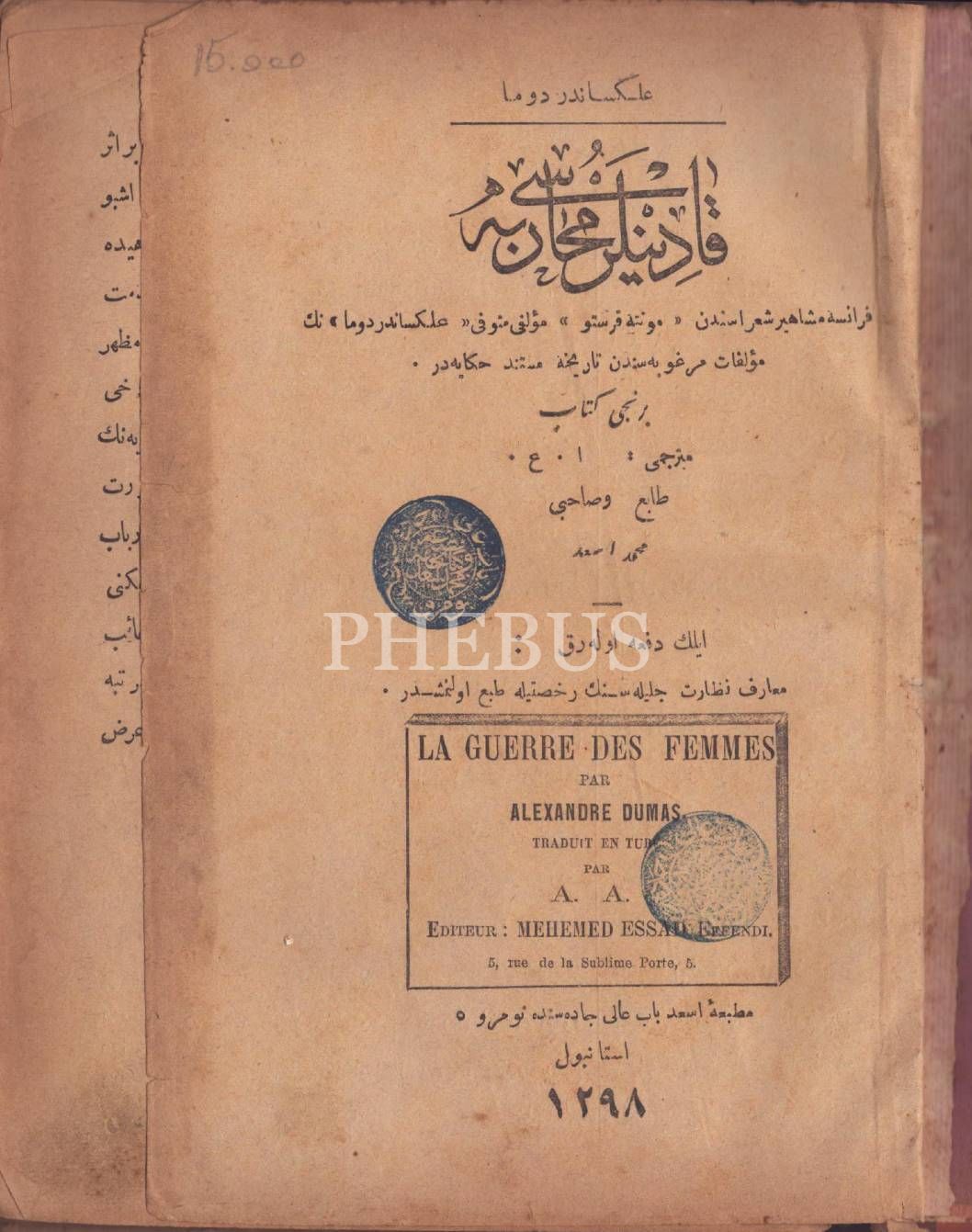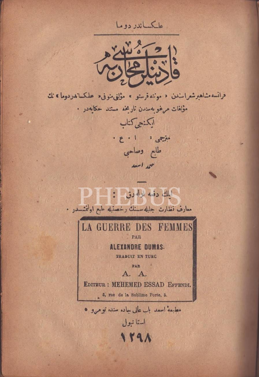 KADINLAR MUHÂREBESİ, Alexandre Dumas, çev. A. A., Esad Matbaası, İstanbul 1298, 447 s., 17x24 cm