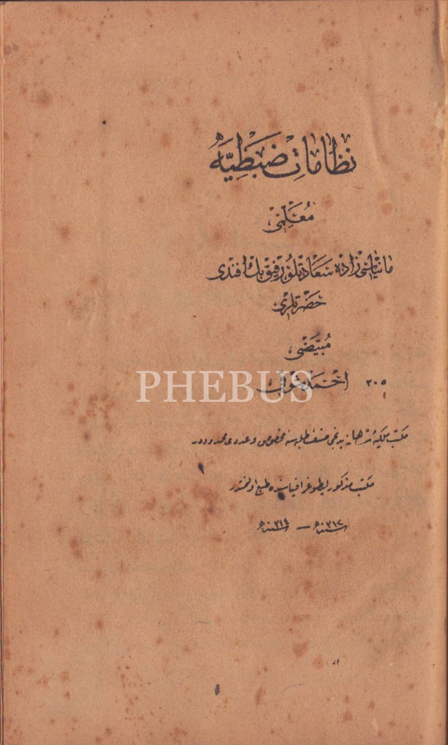 NİZÂMÂT-I ZABTİYYE [Ders Notları], muallimi: Manyasizâde Refik Bey, temize çeken: Ahmed Şevki, Mekteb-i Mülkiye-i Şahane Litografyası, 1314, 109 s., 16x24 cm