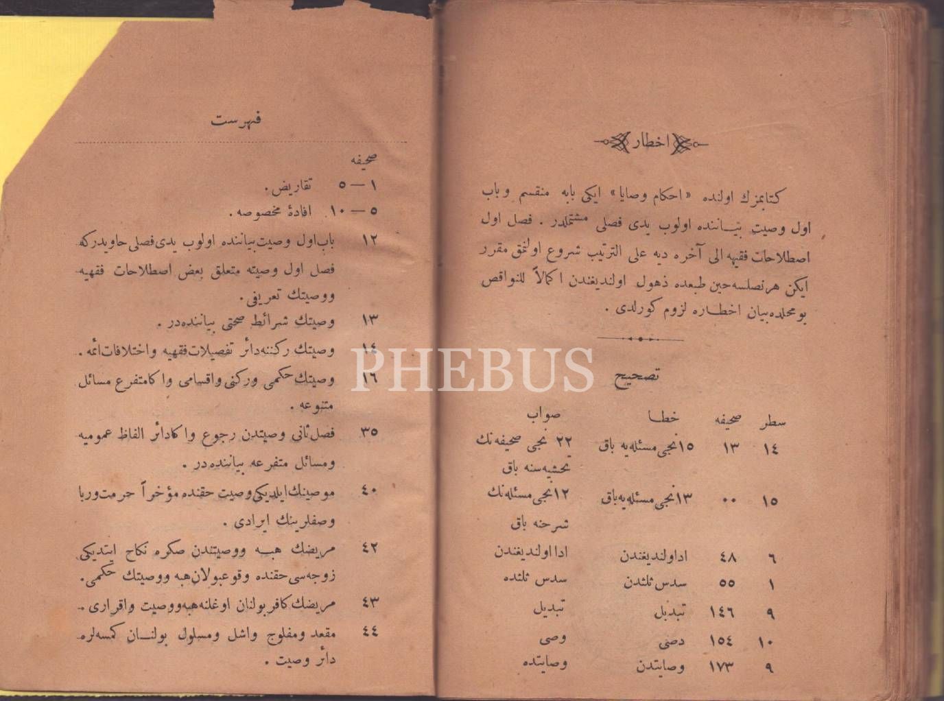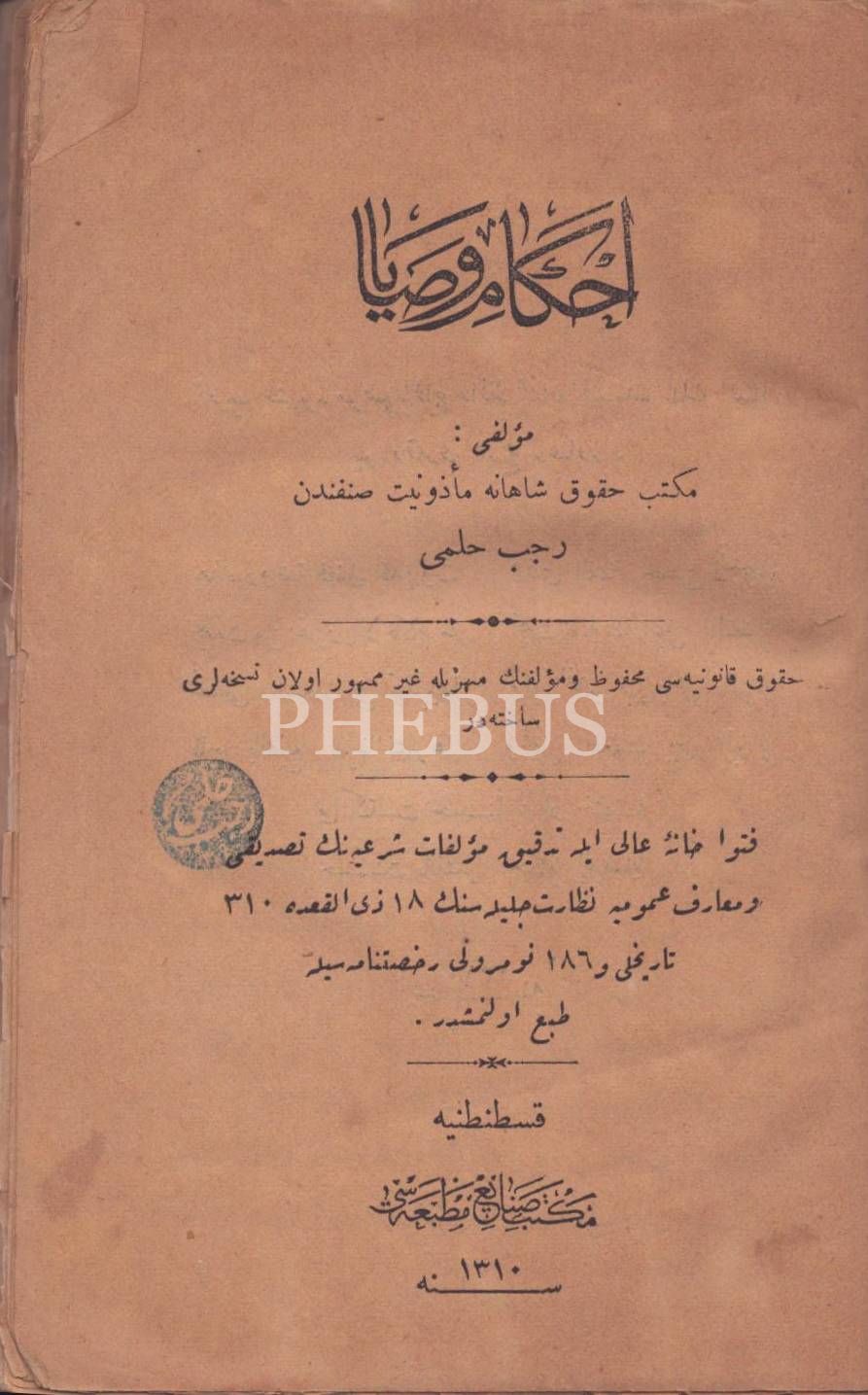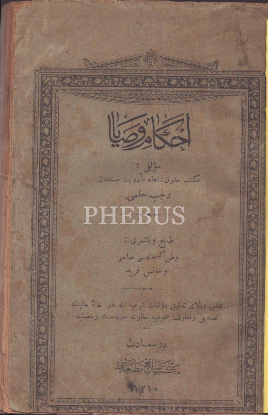 AHKÂM-I VESÂYÂ, Receb Hilmi, Mekteb-i Sanayi Matbaası, İstanbul 1310, 189 s., 13x19 cm