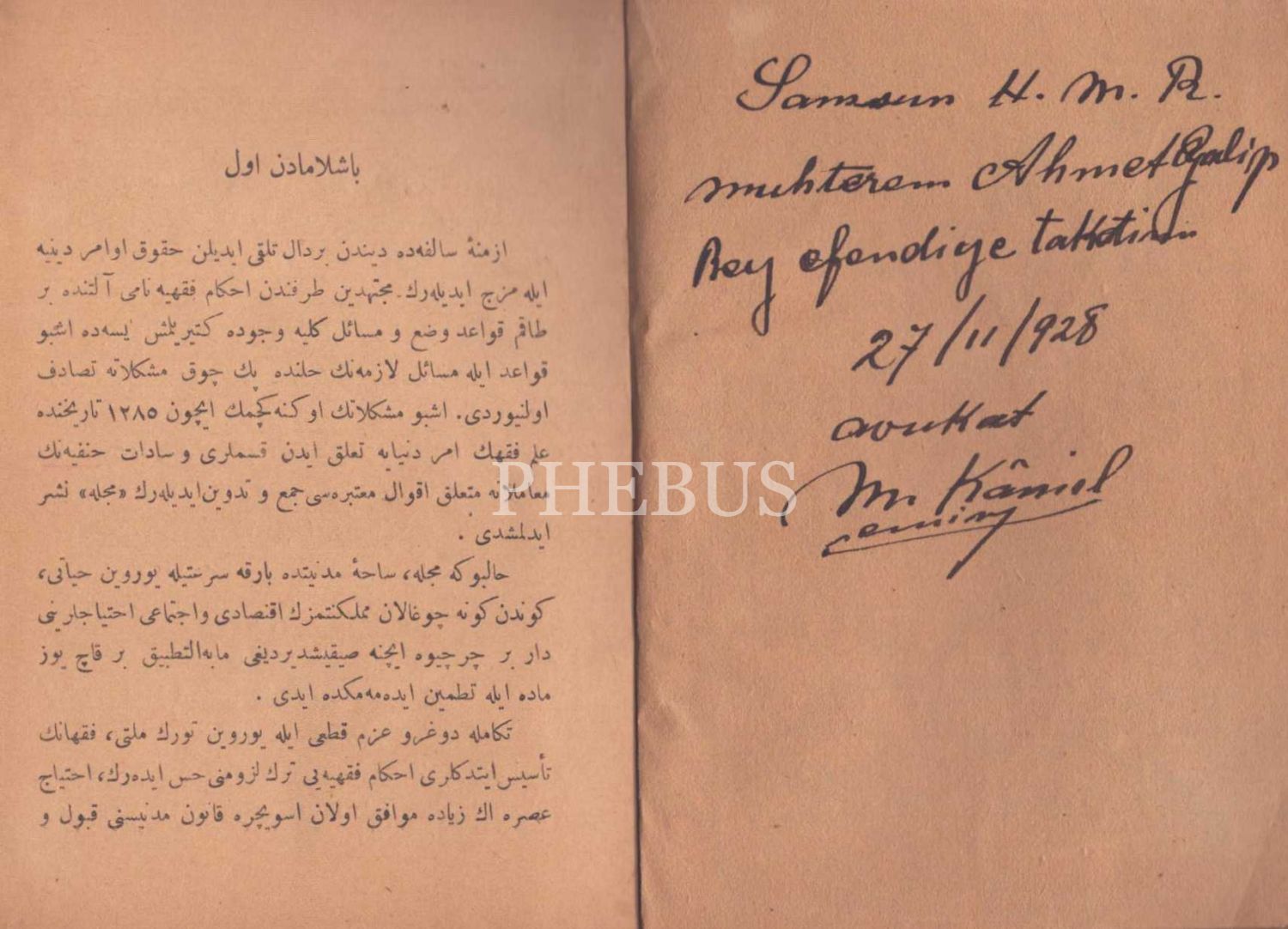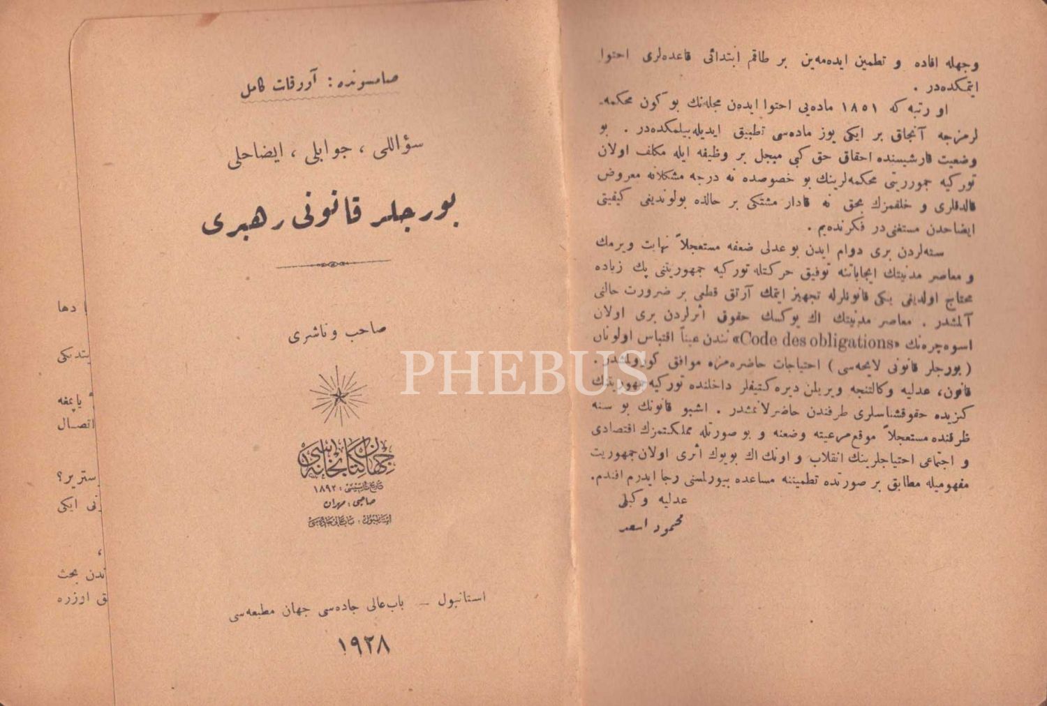 Yazarından ithaflı ve imzalı BORÇLAR KÂNÛNU REHBERİ, Avukat Kâmil, Cihan Matbaası, İstanbul 1928, 315 s., 13x17 cm