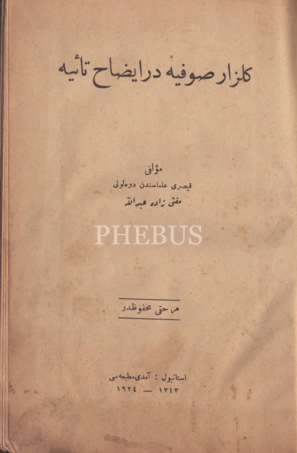 GÜLZÂR-I SÛFİYYE DER ÎZÂH-I TÂİYYE [Kasîde-i Tâiyye Şerhi], Müftizâde Abdullah, Amedi Matbaası, İstanbul 1924, 208 s., 14x21 cm