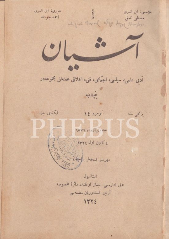 Edebî, siyasi, ahlaki dergi ÂŞİYÂN´ın 2. Cildi (No. 14), Artin Asaduryan Matbaası, İstanbul 1324, 416 s., 17x24 cm