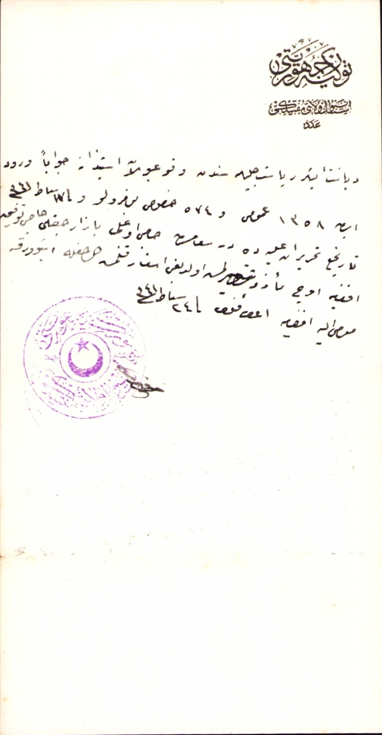 Osmanlı Diyanet İşleri Başkanlığı İstanbul Müftülüğü tarafından Pazarcıklı Hacı Ali Tevfik'in vazifesi konulu evrak, hicri 1341, 10x18 cm
