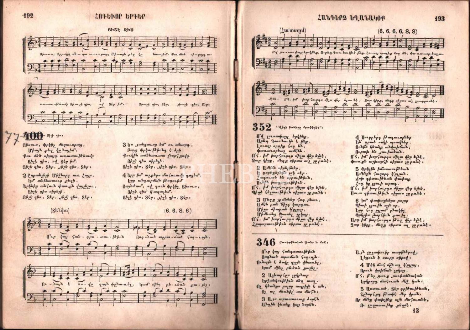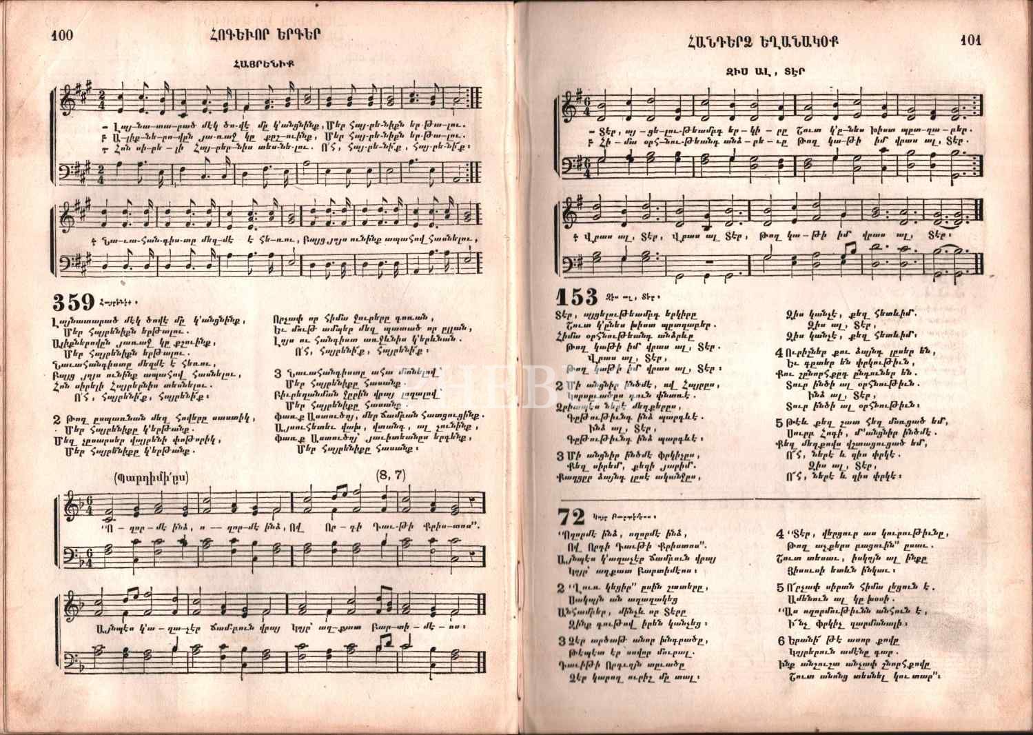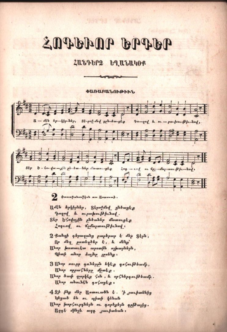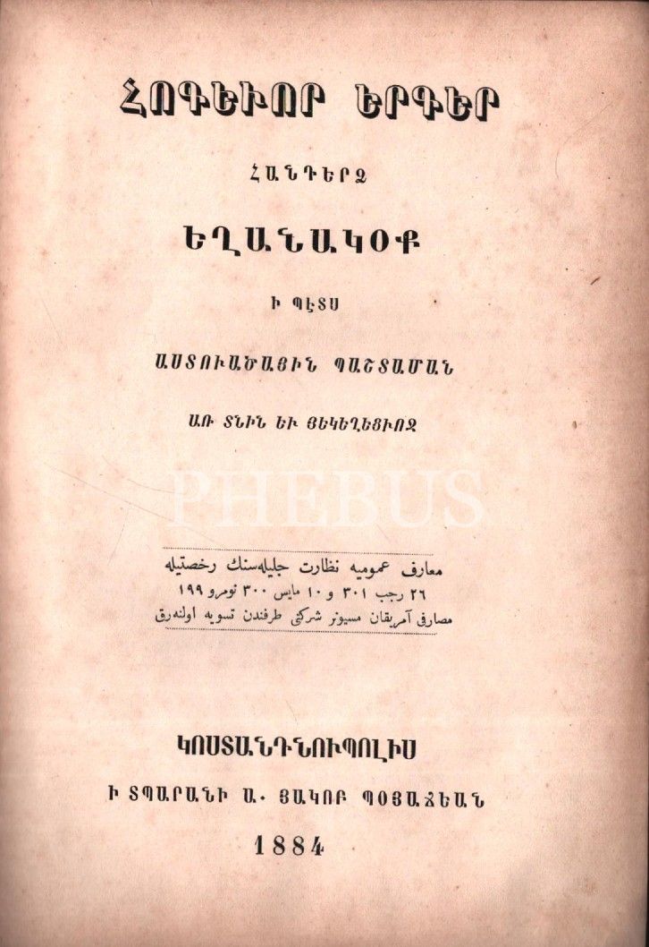 HOKEVOR YERKER HANTERTS YEĞANAGOK (Ezgilerle Ruhani Şarkılar), A. Hagop Boyacıyan Matbaası, Gosdantnubolis (İstanbul) 1884, 221 s., 15x21 cm, cilt sırtı ayrık haliyle