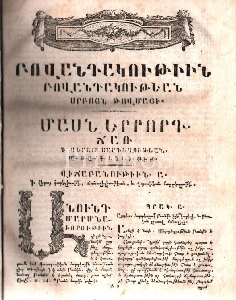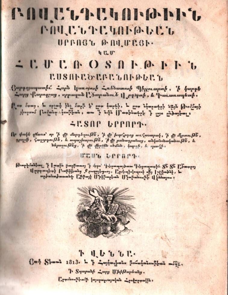 POVANTAGUTYUN POVANTAGUTYAN SRPO TOVMAYİ GAM HAMARODUTYUN ASDVADZAPANUTYUN, HADOR 3-3. (Aziz Tovmasın Metinlerinin İçeriği Veya Teoloji Özeti, 3. Cilt, 3. Bölüm), Mıhitaryan Matbaası, Viyana 1813, 501+40 s., 19x24 cm