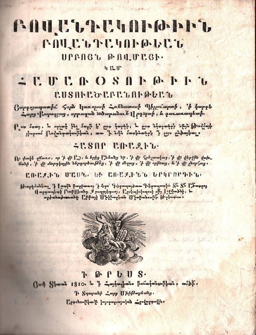 POVANTAGUTYUN POVANTAGUTYAN SRPO TOVMAYİ GAM HAMARODUTYUN ASDVADZAPANUTYUN- HADOR 2, Mıhitaryan Matbaası, Trieste 1810, 406 s., 20x25 cm