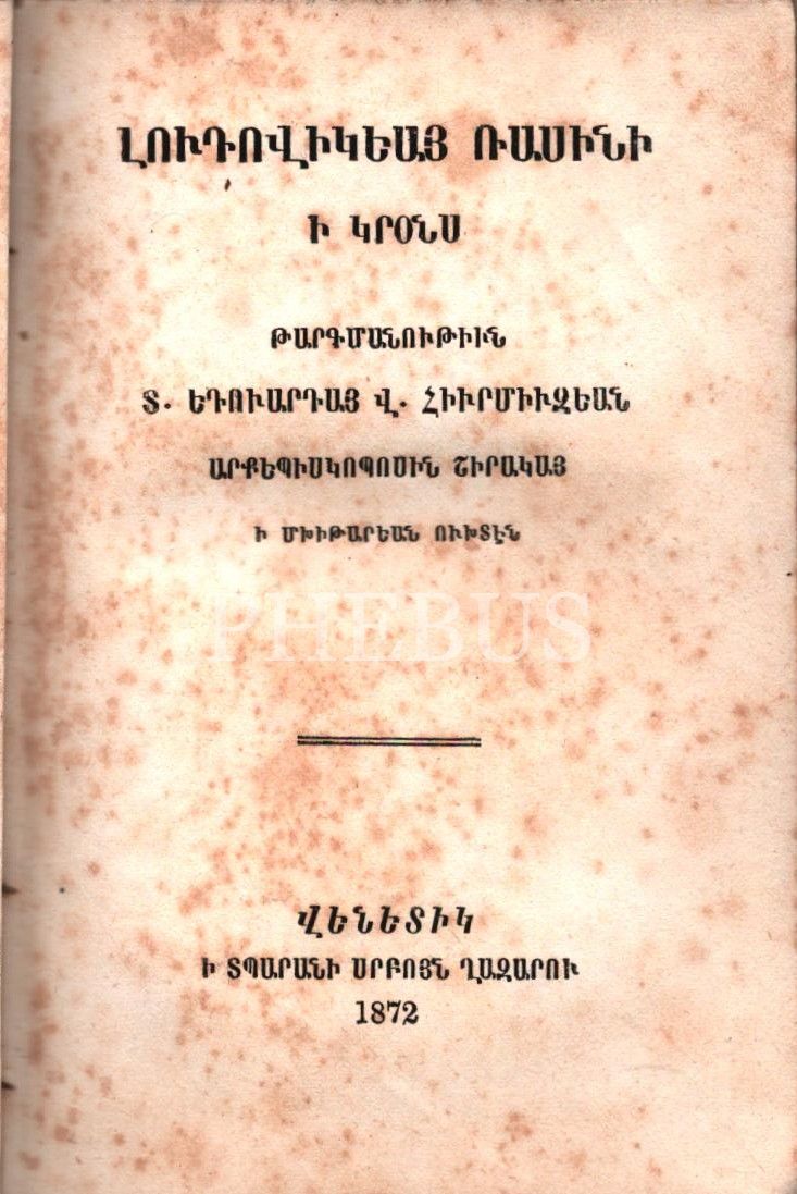 İ GRONIS (Dinim), Ludovigos Rasini, çeviren: Peder Yetvart Hürmüzyan, Surp Ğazar Matbaası, Venedik 1872, 156 s., 10x14 cm