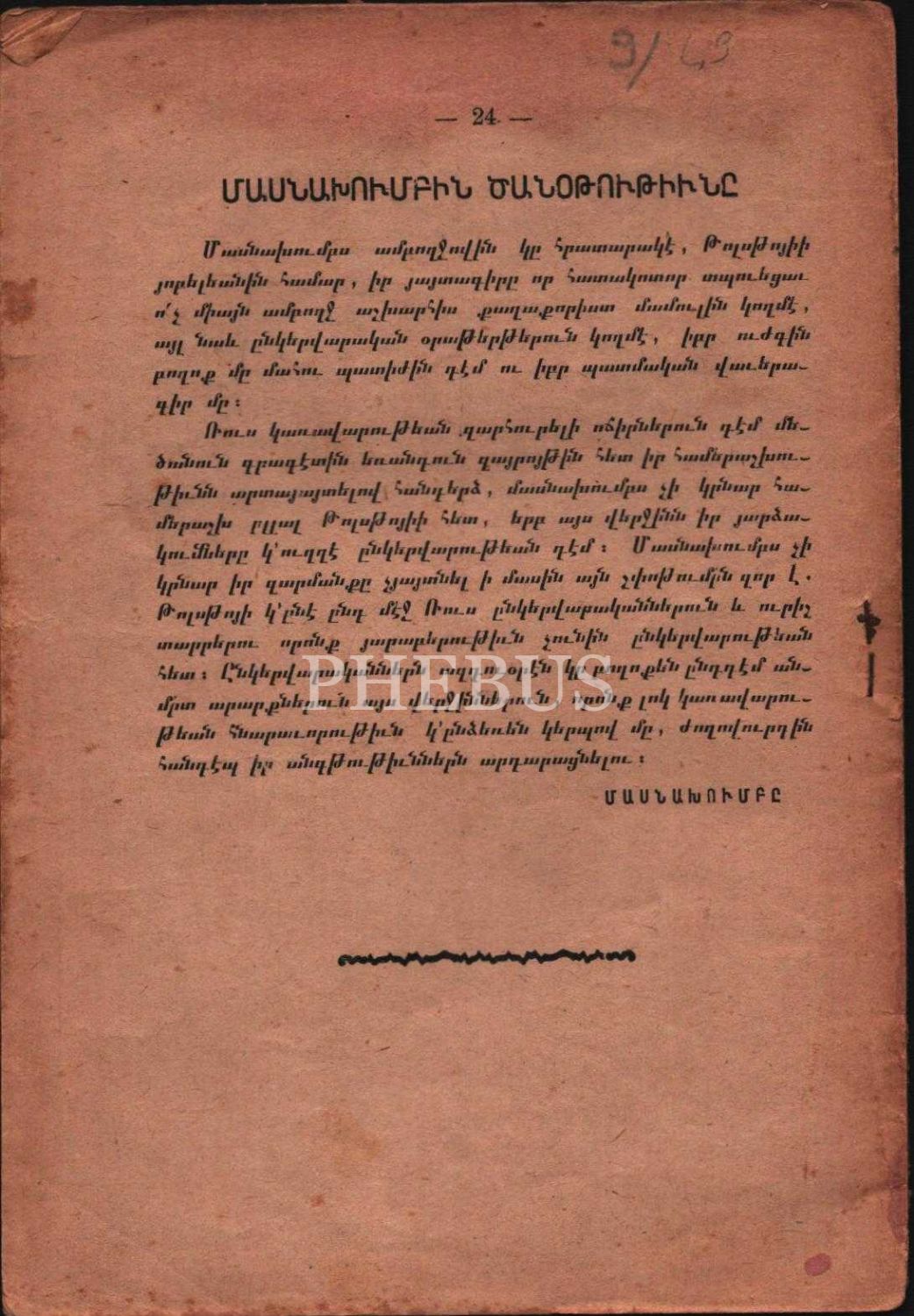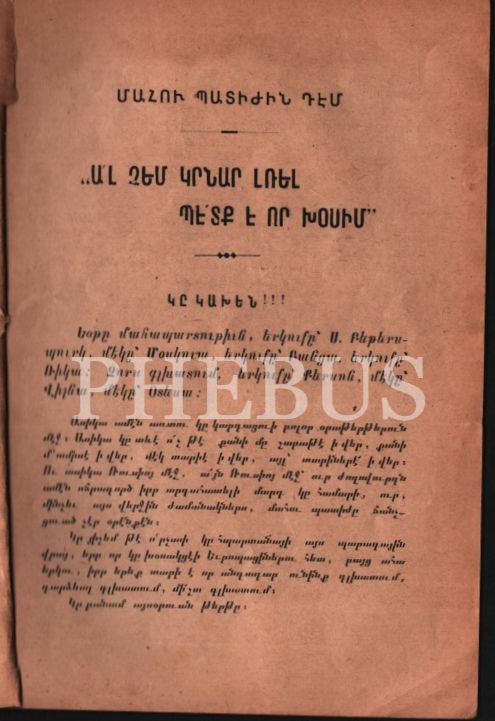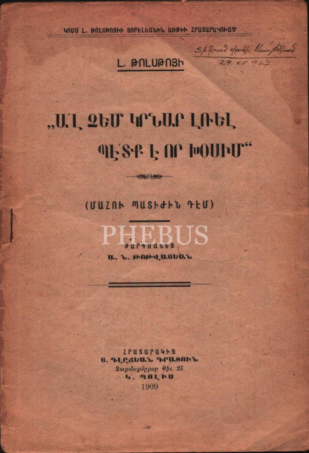 AL ÇEM GIRNAR LREL BEDK E VOR HOSİM (Daha Fazla Susamam Artık Konuşmalıyım), Lev Tolstoy, H. Kılcıyan Kitabevi, G. Bolis (İstanbul) 1909, 24 s., 14x20 cm