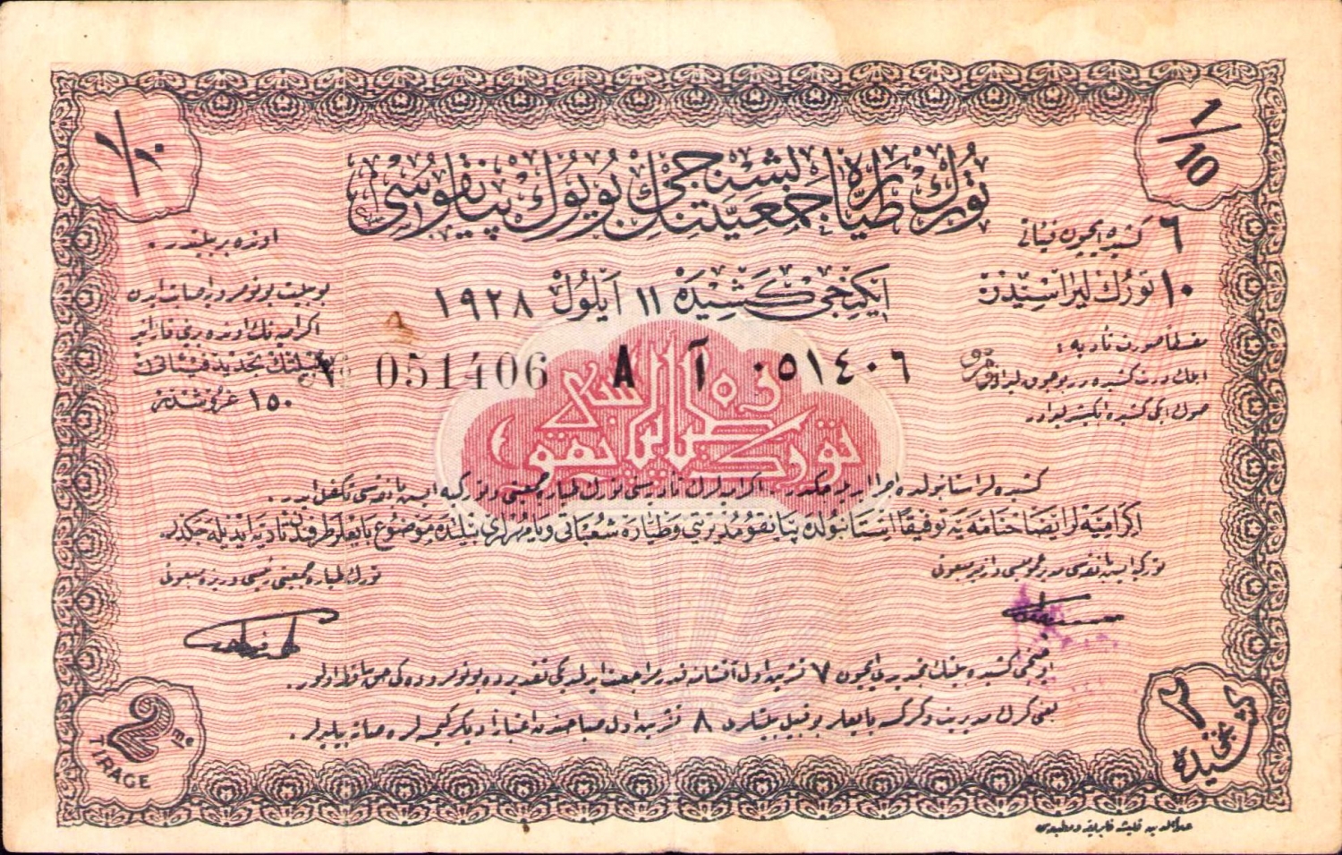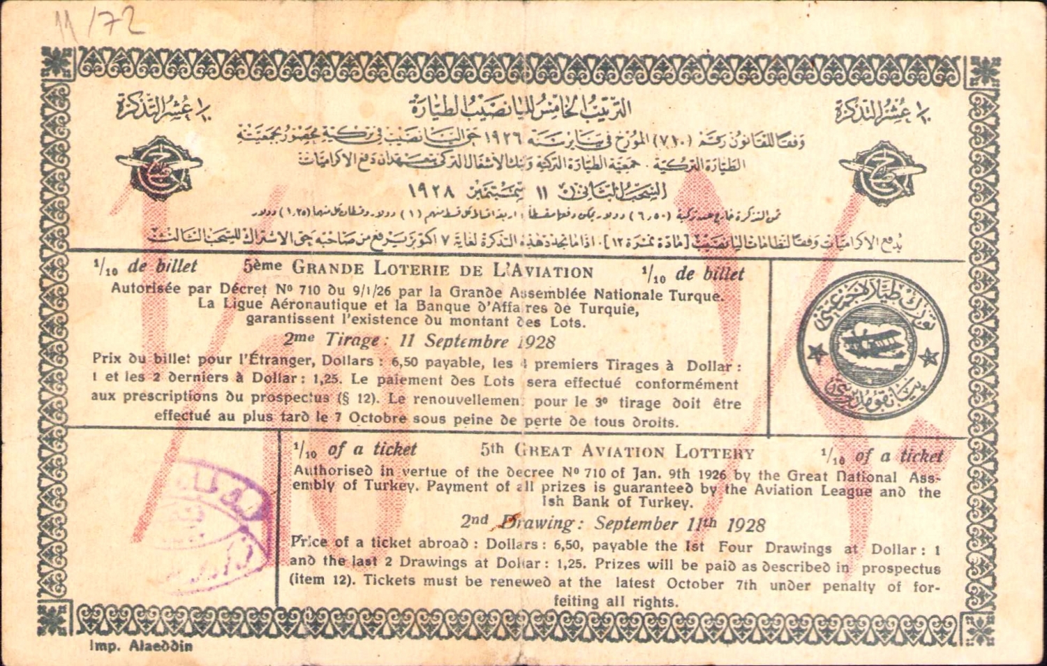 Osmanlıca Türk Tayyare Cemiyetinin 1926 tarihindeki beşinci büyük piyango bileti, 10x16 cm