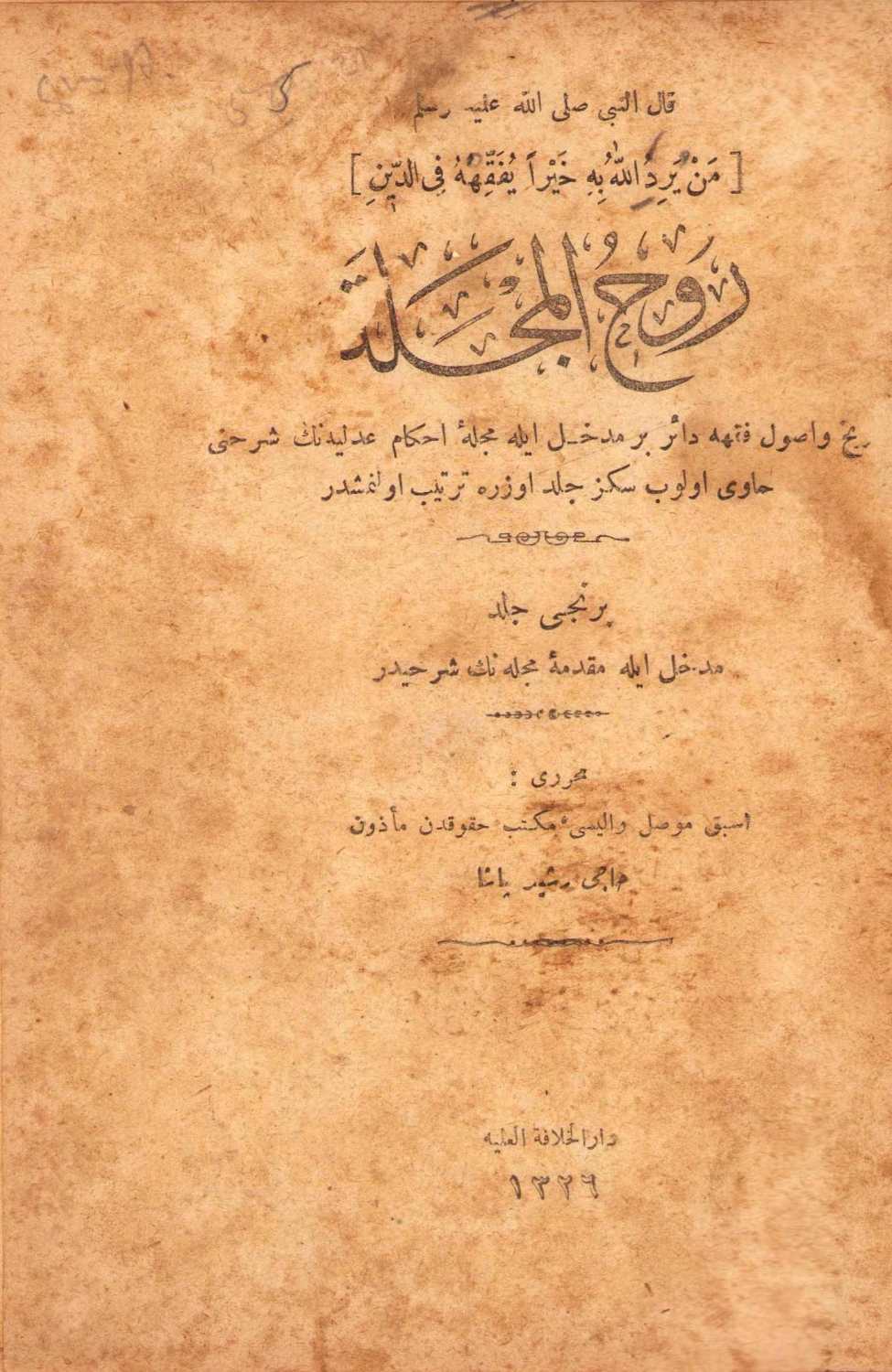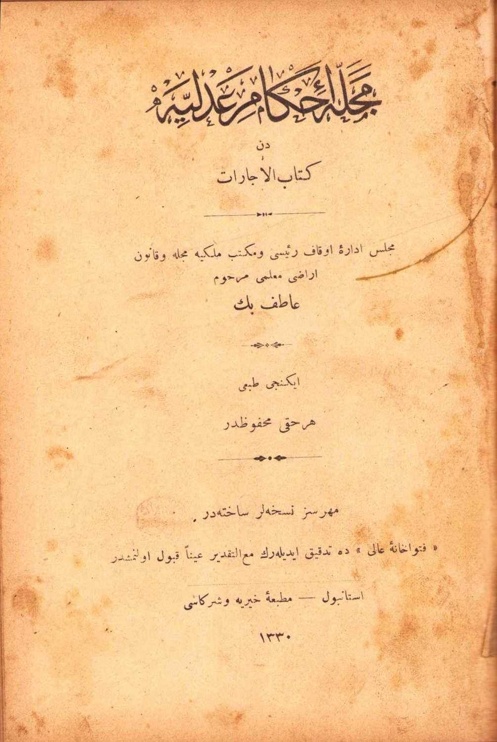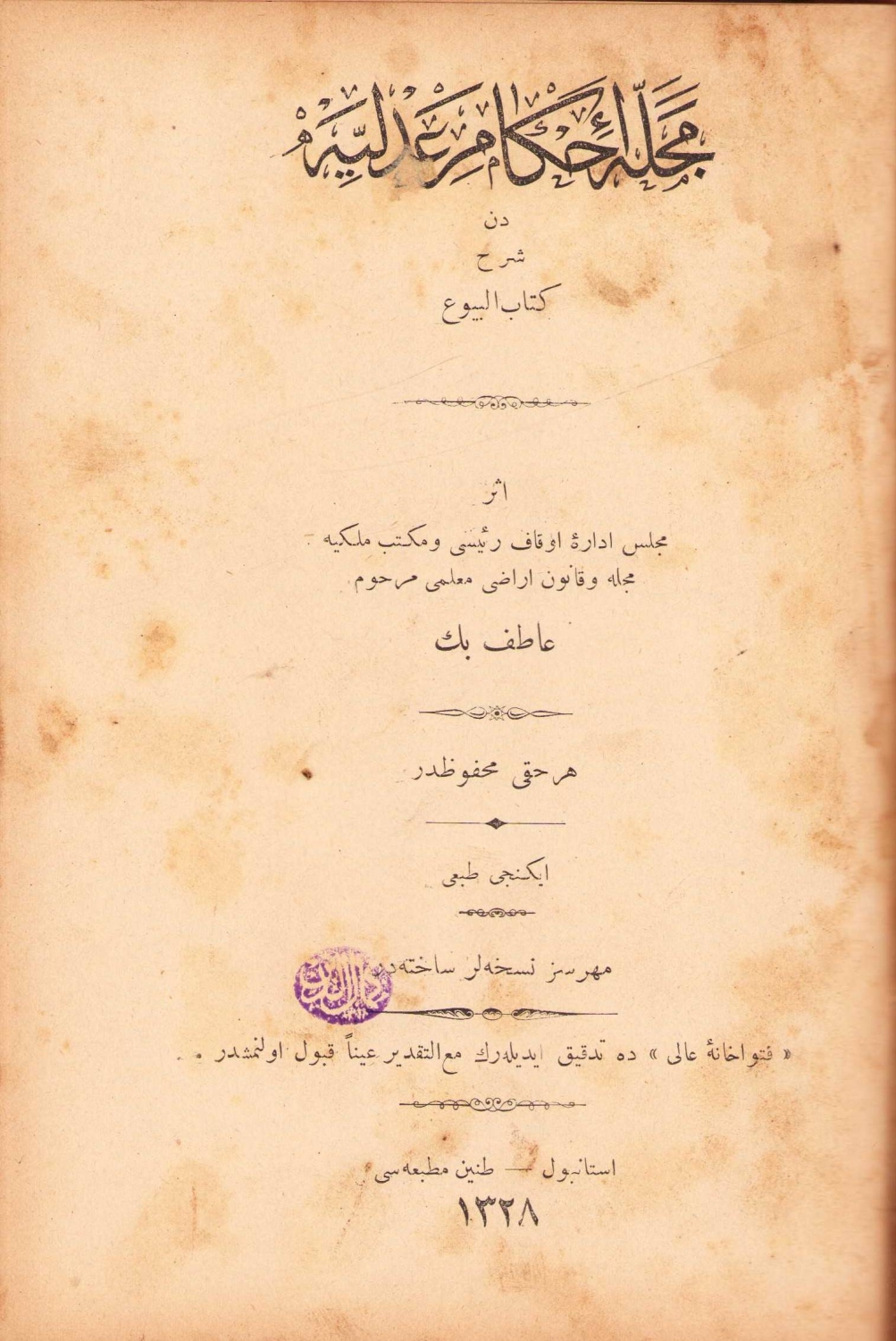 1. Ruhul Mecelle Birinci Cilt, Hacı Reşit Paşa, Matbaa-i Hayriye ve Şürekası, Osmanlıca, 214 sayfa. 2. Mecelle-i Ahkam-ı Adliyeden Şerh-i Kitabü'l-büyu, Kuyucaklı Atıfzade, ikinci baskı, Tanin Matbaası, İstanbul, 1328,190 sayfa, ÖZEGE; 12459. 3. Mecelle-i Ahkam-ı Adliyeden Şerh-i Kitabu'l-icarat, Kuyucaklı Atıfzade, ikinci baskı, Matbaa-i Hayriye ve Şürekası, 1330, 143 sayfa, ÖZEGE; 12466. Mecelle-i Ahkam-ı Adliyeden Şerh-i Kitabü'l-büyu ve icarat kitaplarının son tarafları Atıf Beyin talebesinden Bekir Sami tarafından tamamlanmıştır. İkici baskısı Oğlu Kemâleddin Atıf Bey tarafından bastırılmıştır. 14x20 cm