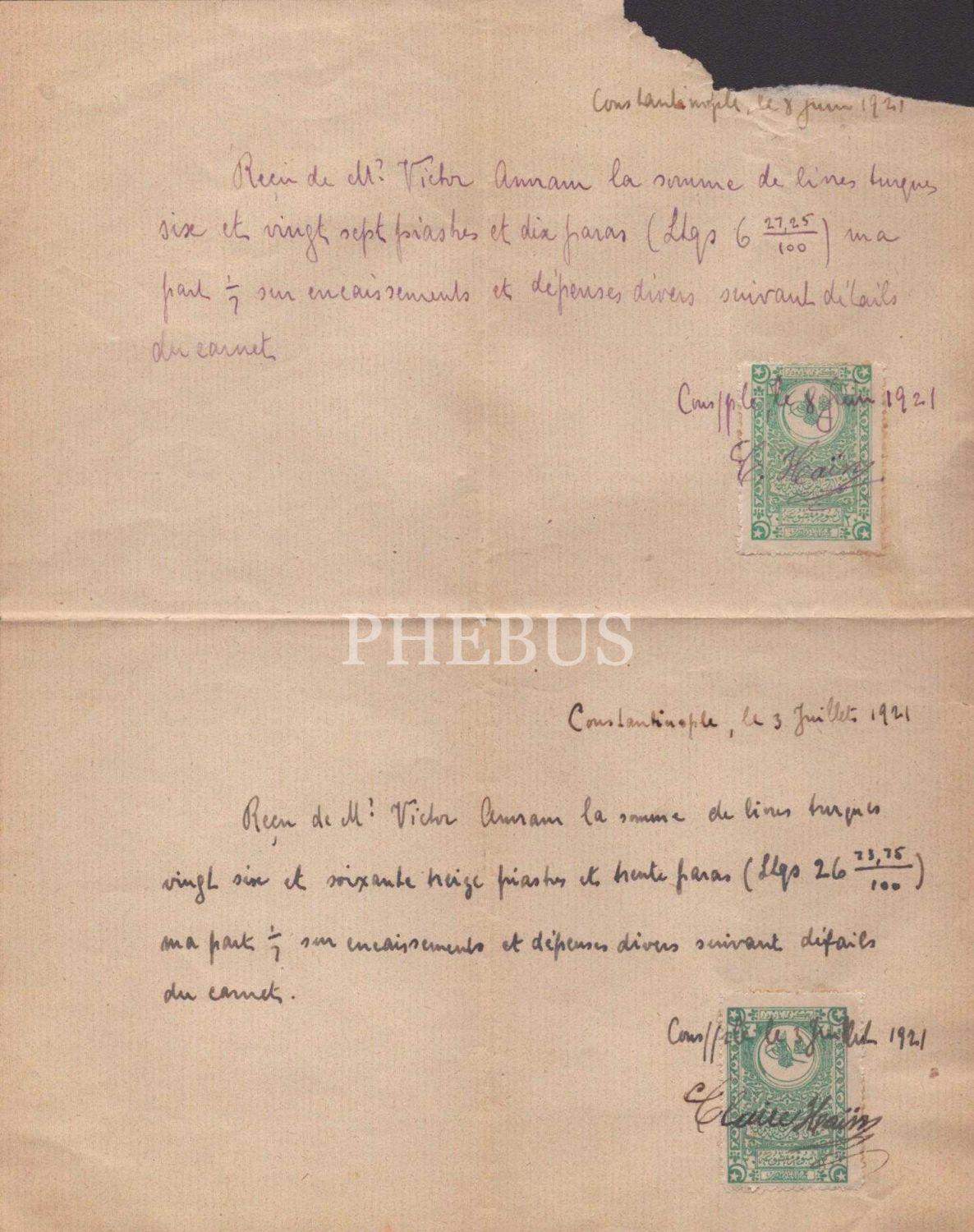 İmzalı ve pullu Fransızca evrak, Constantinople 1921, 19x24 cm