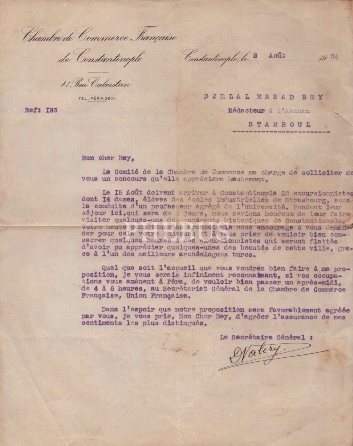 Fransız Ticaret Odası Genel Sekreterliği´nden Celâl Esat Bey´e gönderilen Fransızca evrak, 2 Ağustos 1924, 22x28 cm