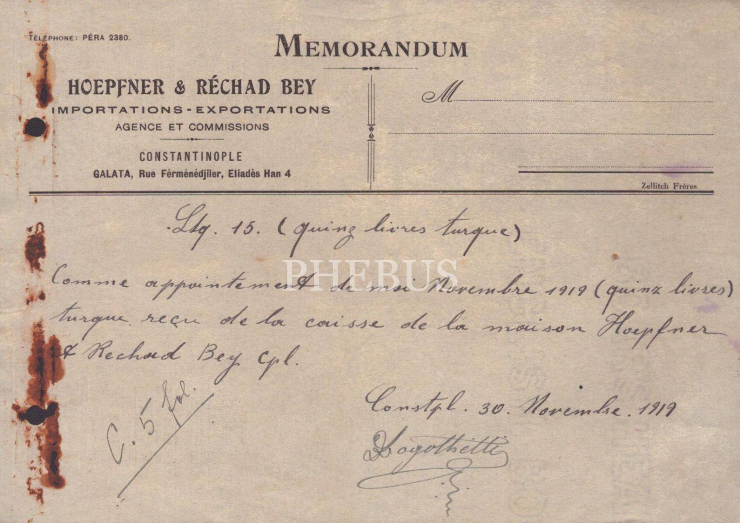 Hoepfner&Rechad Bey Importations-Exportations [İthalat-İhracat] antetli Fransızca memorandum, 30 Kasım 1919, 14x21 cm