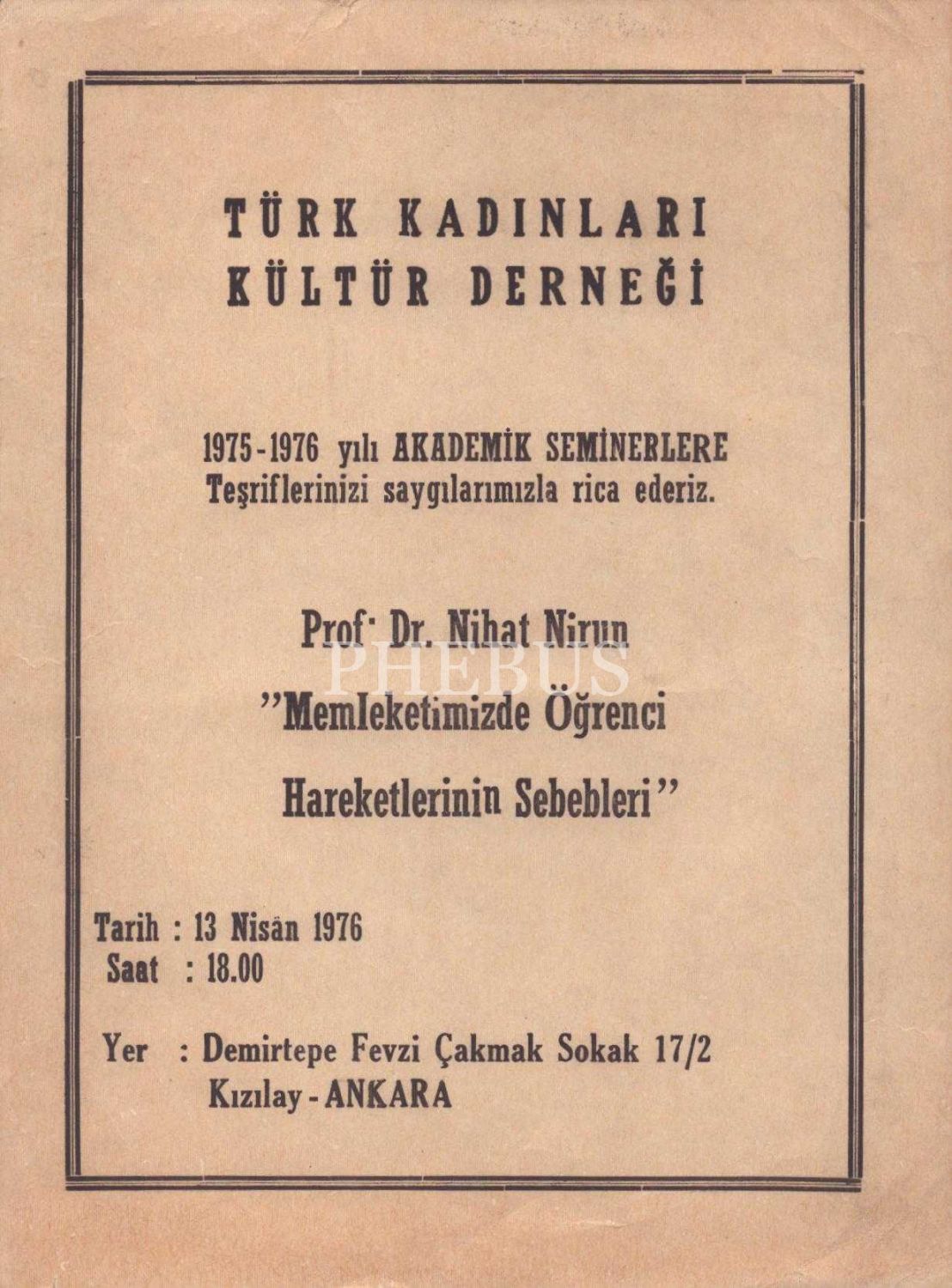 Türk Kadınları Kültür Derneği seminer ilanı, 13 Nisan 1976, 16x21 cm