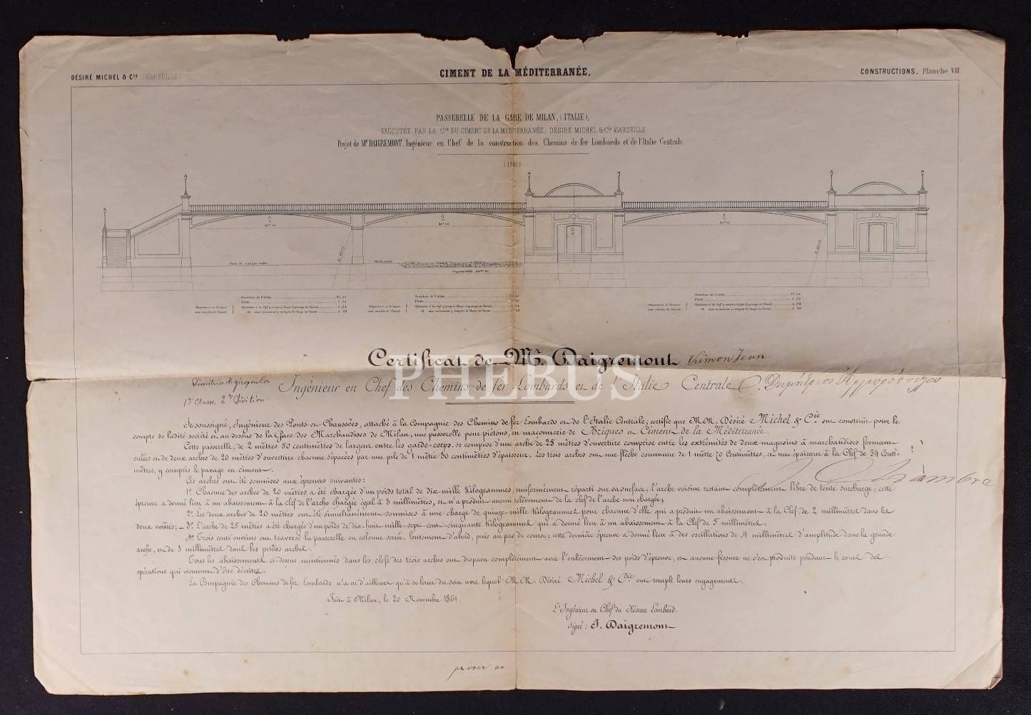 Ciment De La Mediterranee [Akdeniz Çimentosu] Milan İstasyon Yolu projesi başmühendisi Daigeremont´e verilen sertifika, 20 Kasım 1861, 40x60 cm
