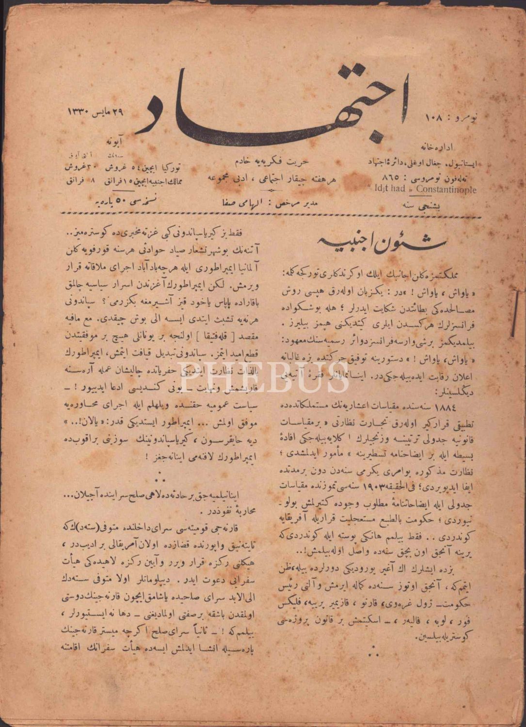 "Hürriyet-i fikriyyeye hâdim" ilmî edebî mecmua İCTİHAD´ın 108. sayısı, 29 Mayıs 1330, 21x29 cm