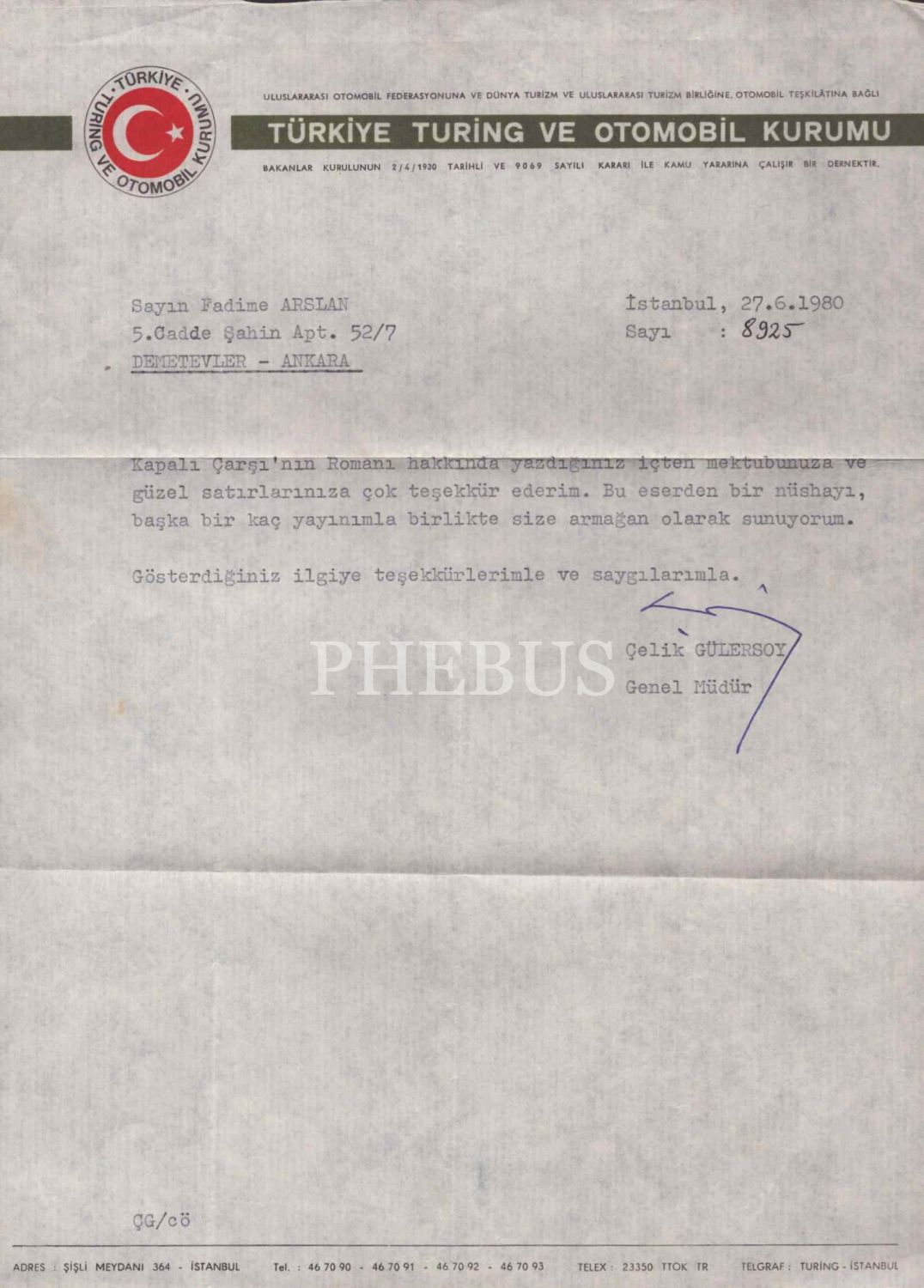 Türkiye Turing ve Otomobil Kurumu Genel Müdürü Çelik Gürsoy imzalı evrak, 27 Haziran 1980, 21x29 cm